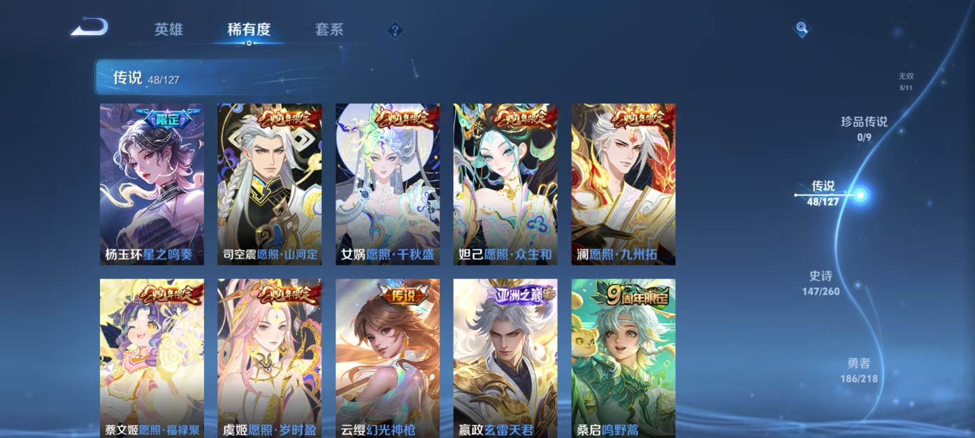 - PX_2099963-Q/永恒钻石/265皮肤/124英雄/3典藏/0珍品无双/0无双/1珍品传说/22传说/78史诗/8稀有英雄 【1 珍品传说】器灵·落星盏 嫦娥, 【3 典藏皮肤】鸣剑·曳影 李白,天鹅之梦 小乔,拾光映像 瑶, 【22 传说皮肤】启明星使 虞姬,云霓雀翎 虞姬,时之祈愿 瑶,地狱火 孙悟空,云鹰飞将 曜,游龙清影 西施,遇见胡旋 貂蝉,猫影幻舞 貂蝉,仲夏夜之梦 貂蝉,海洋