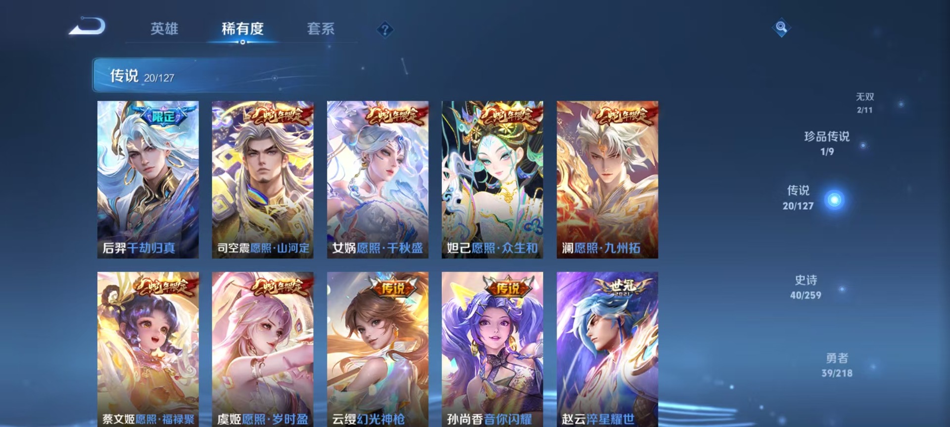 司空震愿照·山河定,裴擒虎李小龙,铠青龙志,女娲愿照·千秋盛,孙悟空至尊宝,盘古冰霜神祇,妲己时之彼端,妲己愿照·众生和,蔡文姬愿照·福禄聚,澜愿照·九州拓,虞姬愿照·岁时盈,关羽冰锋战神