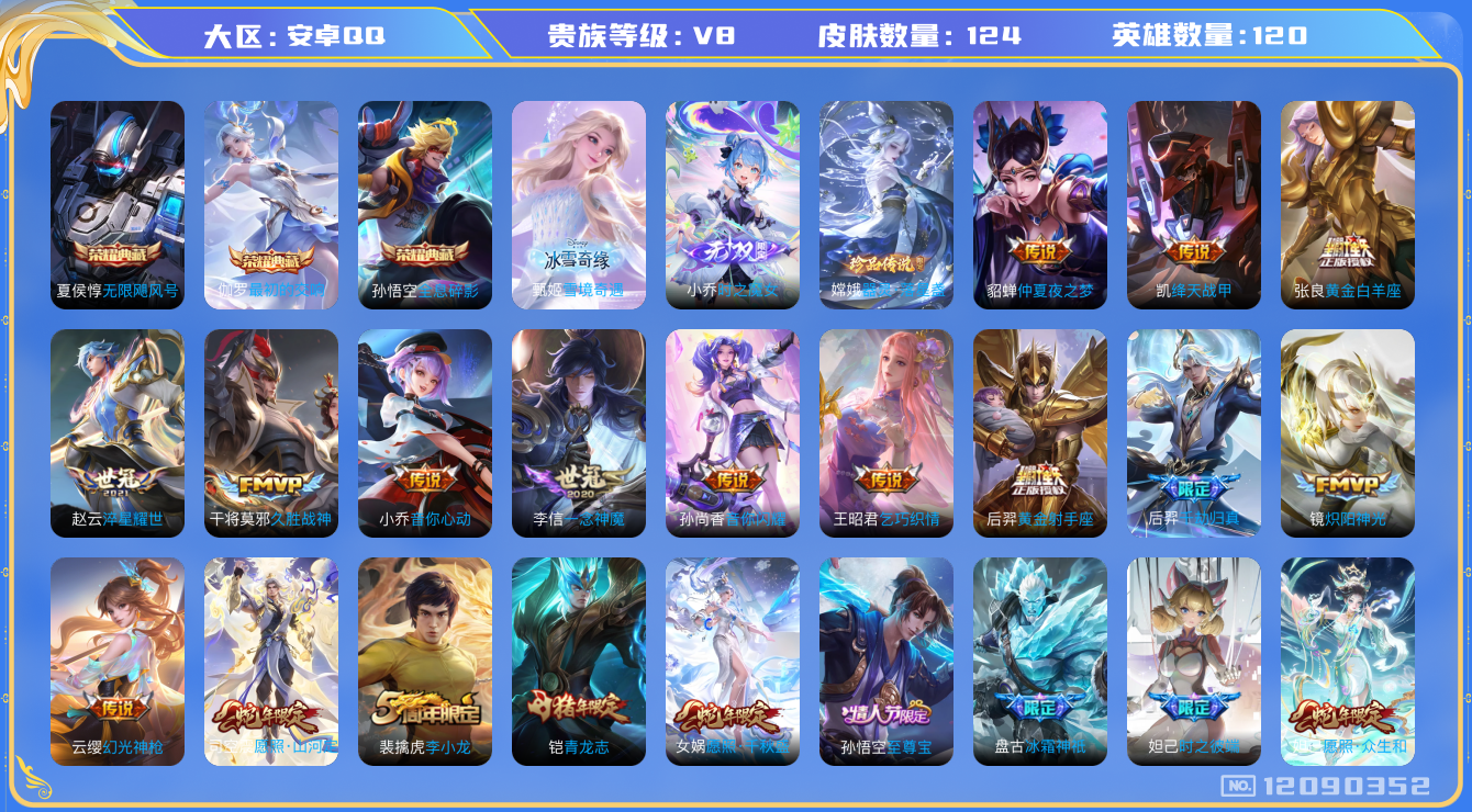 [12090352]V8 3典藏 2无双 1珍品传说 20传说 120英雄 124皮肤 可修改实名 优质装备:无限飓风号(高达),全息碎影(猴子典藏),小乔时之魔女(小乔无双),雪境奇遇-甄姬,最初的交响(伽罗典藏),器灵·落星盏,黄金射手座,绛天战甲(鸡嘴战神),黄金白羊座,久胜战神,炽阳神光,一念神魔,仲夏夜之梦(大飞蛾),音你心动-小乔,乞巧织情,淬星耀世,音你闪耀(rap皮),千劫归真 传说皮:幻光神枪 珍宝阁皮:万物之道 限定皮:愿照·九州拓(澜年限),愿照·福禄聚(蔡文姬年限),愿照·岁时盈(虞姬年限),愿照·山河定(司空震年限),愿照·众生和(妲己年限),愿照·千秋盛(女娲年限),至尊宝,时之彼端,青龙志(铠年限),冰锋战神,李小龙,冰霜神祇 史诗皮:器灵·浮梦炉,化蝶舞,龙之律动,茶境仙,紫霞仙子,黄金分割率,千年之狐,冰冠公主,偶像歌手,暗夜猫娘,龙骑士(小龙虾),时之恋人-孙尚香,修罗,女仆咖啡,水果甜心,星夜王子,功夫厨神,心灵战警,地狱岩魂,诗语江南,纤云弄巧,繁星吟游(呼啦呼啦),水晶猎龙者,曙光守护者,圣诞狂欢,鹰眼统帅,王者之锤,魅力维加斯