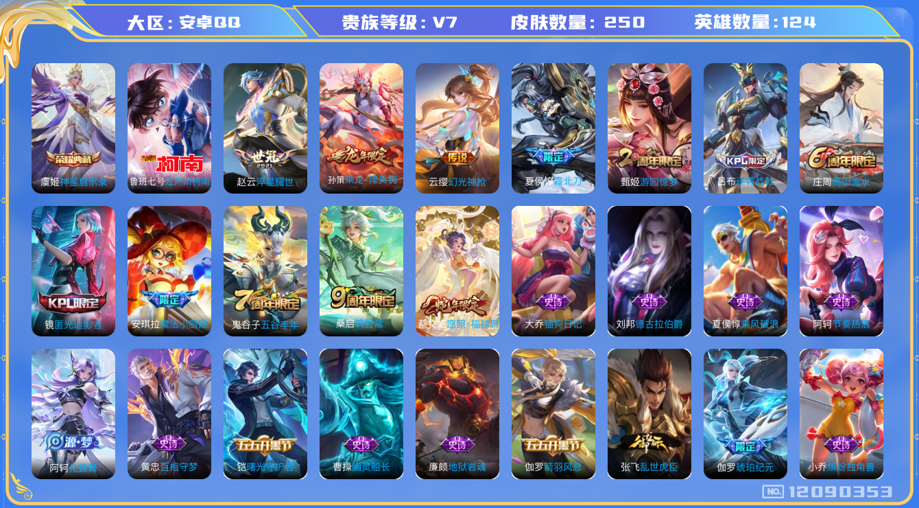 [12090353]V7 1典藏 1珍品传说 6传说 124英雄 250皮肤 可修改实名 女号 优质装备:神鉴启示录,江户川柯南,淬星耀世 传说皮:乘龙·淬吴钩(孙策年限),幻光神枪 珍宝阁皮:万物之道,蔷薇恋人,玩趣恶龙 限定皮:愿照·福禄聚(蔡文姬年限),逐霄战戟,鸣野蒿,夏侯惇霜北刀,魔法小厨娘,高山流水,五谷丰年,游园惊梦,匿光追影者 史诗皮:化蝶舞,星界战将,龙之律动,石田雨龙,破空之剑,蒙犽顽岩魄,芈月浮光幕影,琥珀纪元伽罗,蔬乡物语(鲁班七号),百相守梦-百里守约,百相守梦-黄忠,紫霞仙子,苍穹之光,特工魅影,江河有灵,雪夜绮愿(周瑜),百解令(蒙犽),蒙恬荣光圣徽,无限星赏官,冰冠公主,偶像歌手,电玩·爆裂旋风,龙骑士(小龙虾),末日机甲-吕布,猫狗日记-孙策,猫狗日记-大乔,时之恋人-孙尚香,乱世虎臣,节奏热浪,修罗,女仆咖啡,摇滚巨星,水果甜心,绅士熊喵,天才门将,星夜王子,心灵骇客,功夫厨神,德古拉伯爵,暗隐猎兽者,幽灵船长,鬼剑武藏,心灵战警,天秀·启明,舞动绿茵,地狱岩魂,拒霜思,缤纷独角兽,乘风破浪,逐浪之夏,水晶猎龙者,曙光守护者,箭羽风息,金属风暴,原初追逐者,圣诞狂欢,圣诞恋歌,鹰眼统帅,暗夜贵公子,魅力维加斯,黎明之约,无心