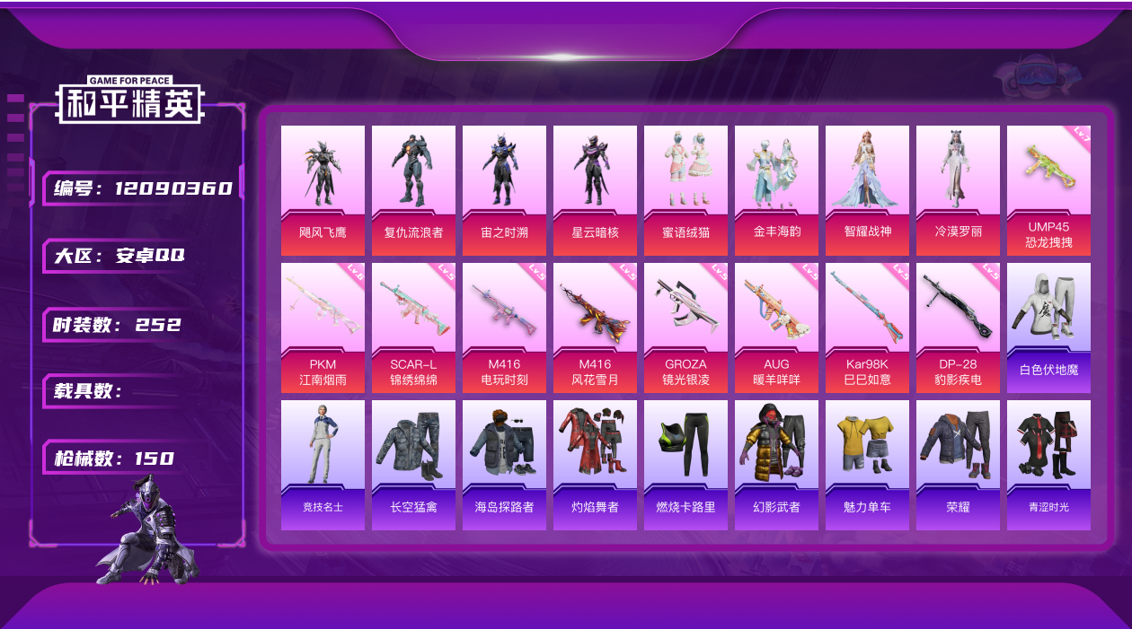 - PX_2114356-实名: 可修改 时装数: 344 载具数: 3 枪械数: 100 战备数: 79 热门装扮: 蝶舞迷情,深海曼妙,浪漫波比,万圣娃娃,爱崽白熊,PEL轰鸣竞梦者,冰霜白皇,暗星紫秘,紫电风暴,赤焰黑爵,冷魅冰骑,大橘为重,罗小黑,暗夜魅影 载具: 特斯拉Model 3(冷光银),阿斯顿·马丁DBX(橙),路特斯ELETRE(冰川蓝) 稀有枪皮: M24暗星紫秘,M762冷魅冰