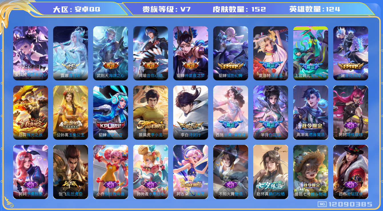 [12090385]V7 1珍品传说 9传说 124英雄 152皮肤 典藏英雄武则天 可修改实名 优质装备:酷洛米之心,猫影幻舞,仲夏夜之梦(大飞蛾),海洋之心,音你心动-周瑜,浮生妄,妄想奇谈,霜月吟,澜逐花归海 珍宝阁皮:万物之道 限定皮:白晶晶,至美·乘鲤谣,诗剑行,逐梦之音,李小龙,辉光之辰,玉兔公主 史诗皮:鸭鸭历险记-刘禅,龙之律动,雪豹·霜爪,蔬乡物语(鲁班七号),紫霞仙子,江河有灵,鹤归松栖(赵怀真),魅语,高渐离燃音魔法,蒙恬荣光圣徽,偶像歌手,电玩·爆裂旋风,暗夜猫娘,乱世虎臣,节奏热浪,女仆咖啡,摇滚巨星,水果甜心,暗隐猎兽者,鬼剑武藏,舞动绿茵,拒霜思,缤纷独角兽,水晶猎龙者,唤灵魅影,圣诞狂欢,圣诞恋歌,鹰眼统帅,魅力维加斯,黎明之约