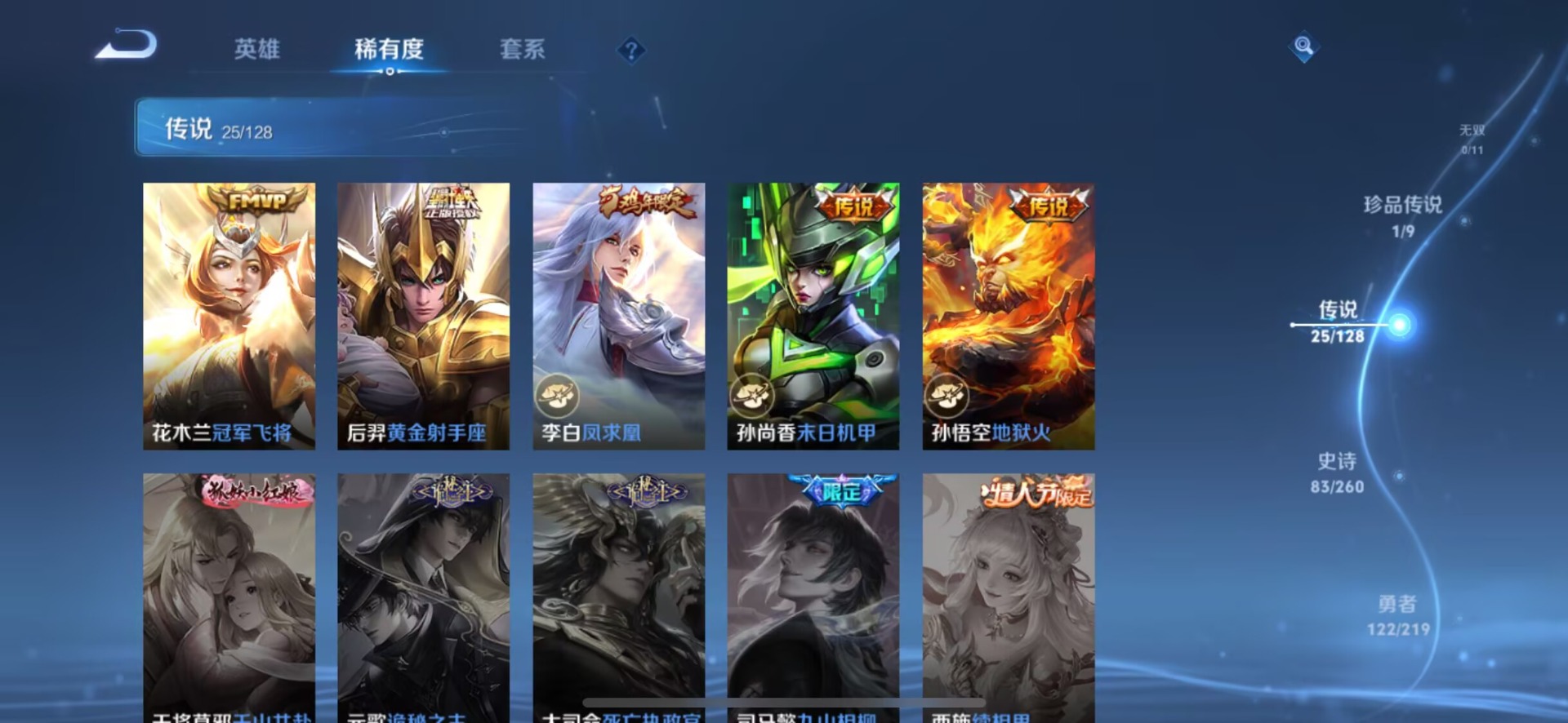 - [12075182]V8 1典藏 19传说 125英雄 222皮肤 可修改实名 优质装备:鸣剑·曳影,云鹰飞将(小将军),绛天战甲(鸡嘴战神),炽阳神光,一念神魔,云霓雀翎,仲夏夜之梦(大飞蛾),李逍遥,淬星耀世,末日机甲-孙策,山海·苍雷引(电光曜子),浮生妄 传说皮:云诺千山 珍宝阁皮:优雅恋人,女武神 限定皮:白虎志(电光耗子),凤求凰(白切鸡),异界灵契(白毛香),时雨天司(水龙头),神威(电光马子),遇见飞天,高山流水,诗剑行,五谷丰年,御风骁将(吕布年限),祈雪灵祝(雪兔子),天狼绘梦者,李小龙,默契交锋-花木兰,大圣娶亲 史诗皮:鸭鸭历险记-刘禅,龙之律动,石田雨龙,织梦人,紫霞仙子,电玩小子(小书包),白龙吟,特工魅影,千年之狐,永昼,江河有灵,魅语,无限星赏官,冰冠公主,偶像歌手,白蛇,晚萤,电玩·爆裂旋风,暗夜猫娘,猫狗日记-孙策,时之恋人-孙尚香,节奏热浪,修罗,女仆咖啡,水果甜心,天才门将,星夜王子,时之奇旅-安琪拉,功夫厨神,德古拉伯爵,暗隐猎兽者,幽灵船长,鬼剑武藏,暗渊魔法,舞动绿茵,地狱岩魂,纤云弄巧,繁星吟游(呼啦呼啦),拒霜思,缤纷独角兽,乘风破浪,逐浪之夏,曙光守护者,热力回旋,箭羽风息,原初追逐者,圣诞恋歌,鹰眼统帅,魅力维加斯,黎明之约,赏金猎手,无心,未来纪元-赵云