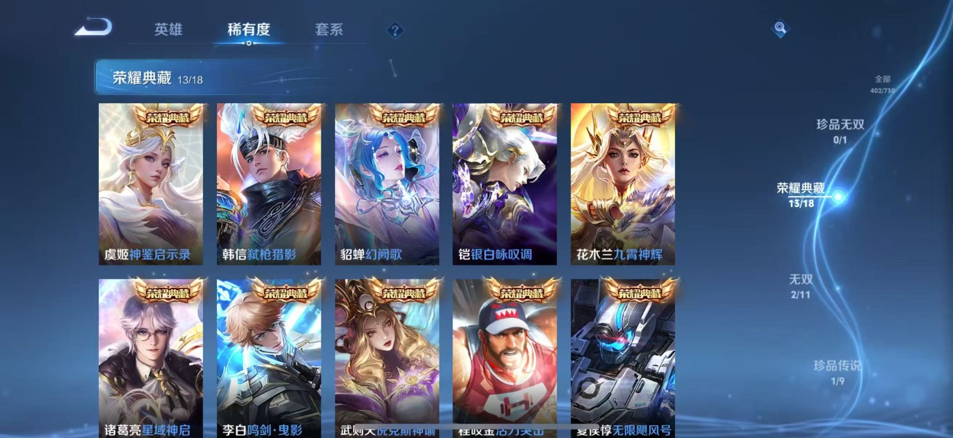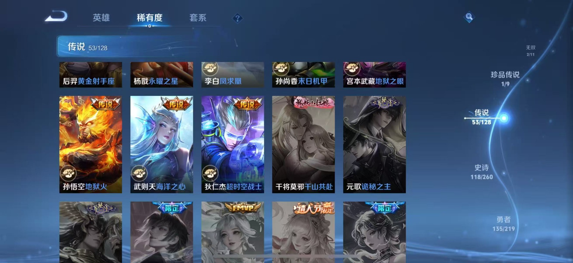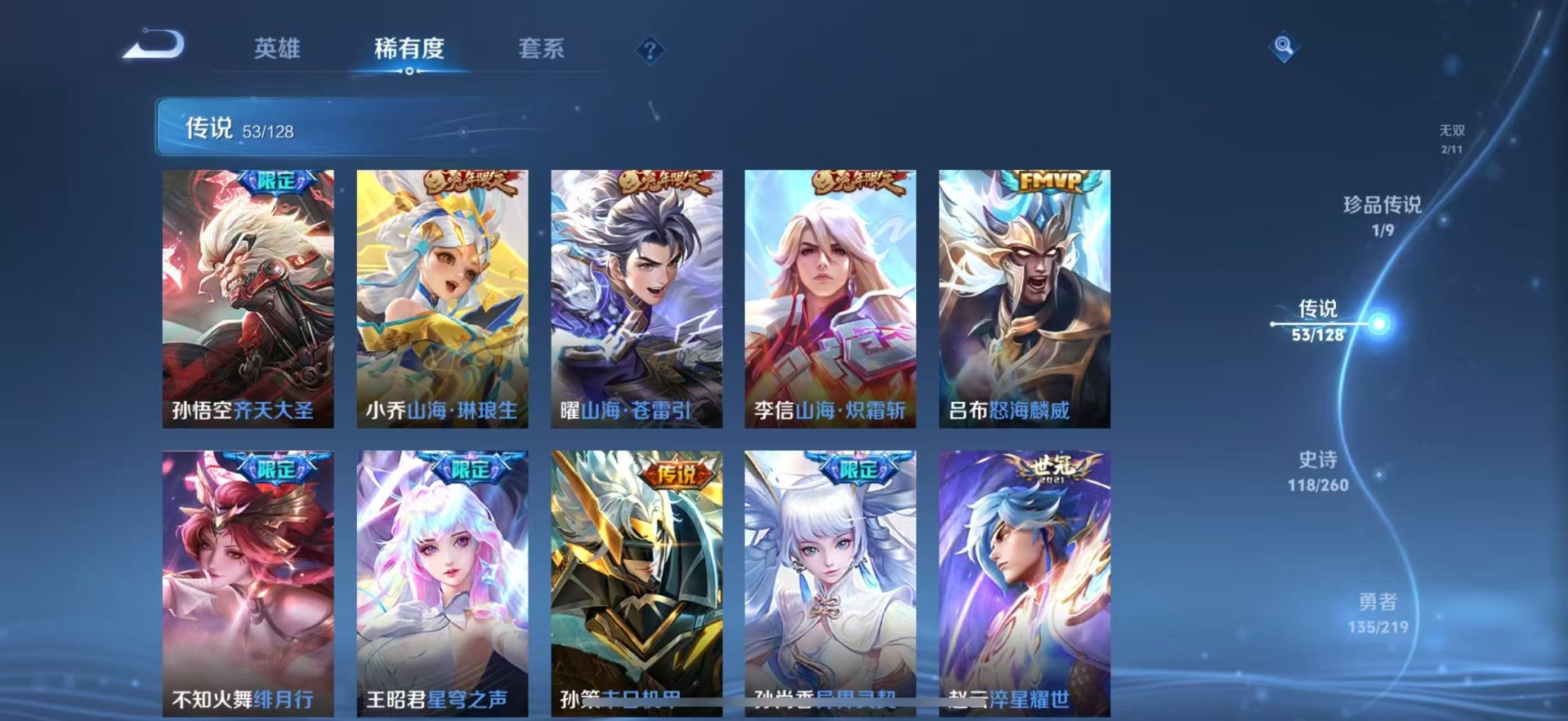 - PX_2058716-性别: 男号 贵族等级: V7 英雄数: 121 皮肤数: 256 荣耀水晶: 天鹅之梦,杀手不太冷 传说皮: 云霓雀翎,音你心动-小乔,山海·炽霜斩,山海·琳琅生 限定皮: 遇见飞天,李小龙,梁祝,白晶晶,天狼溯光者,蜜橘之夏,冰霜恋舞曲,如梦令-嫦娥,纯白花嫁,一生所爱,霸王别姬-虞姬,高山流水,匿光追影者,傲雪梅枪,百木心枪,玉兔公主,五谷丰年,鸣野蒿