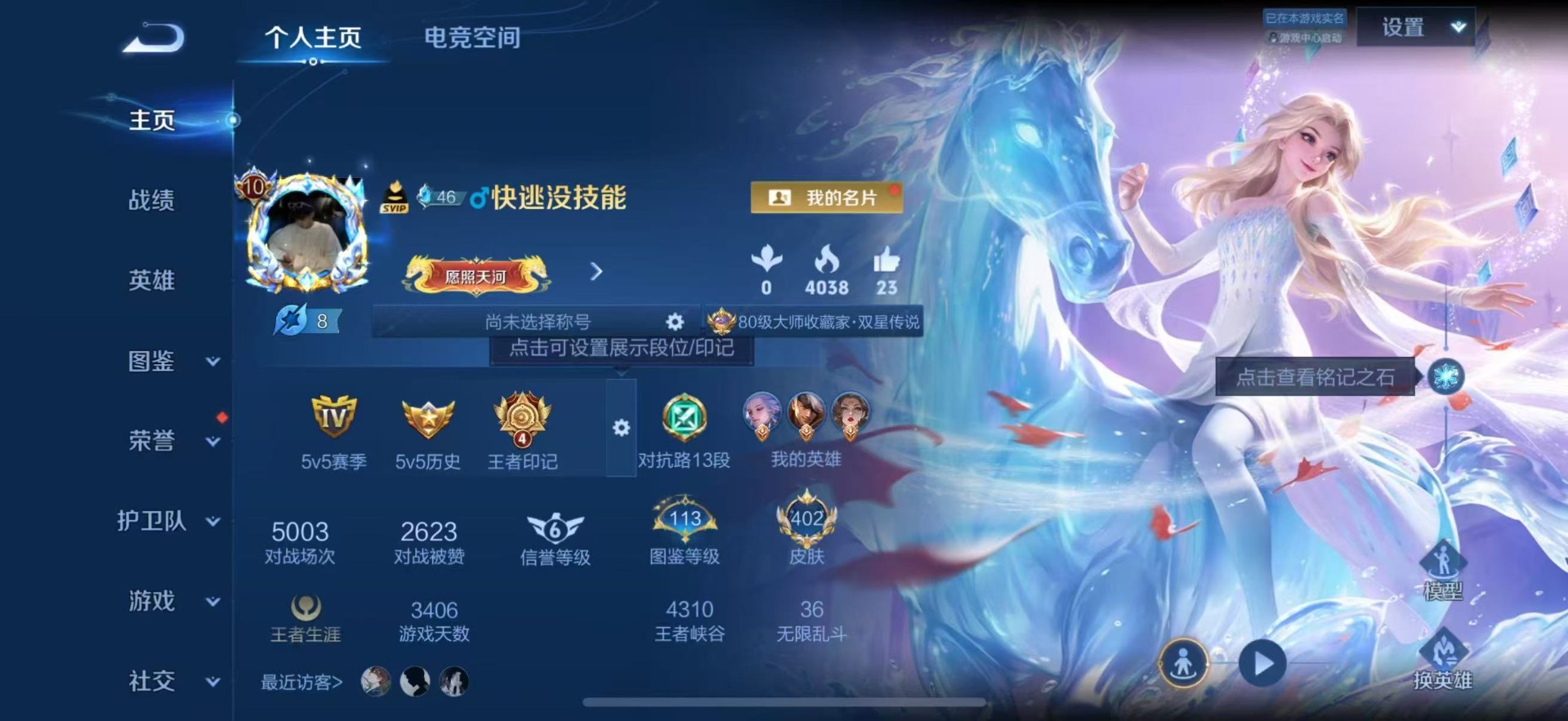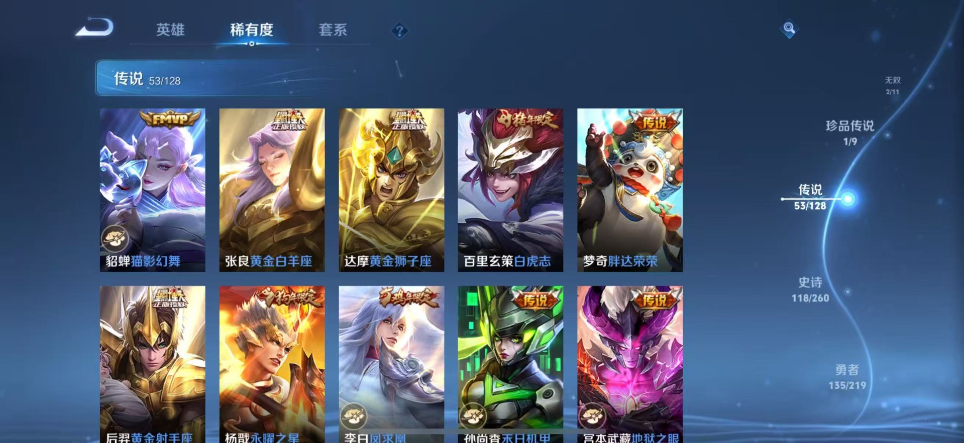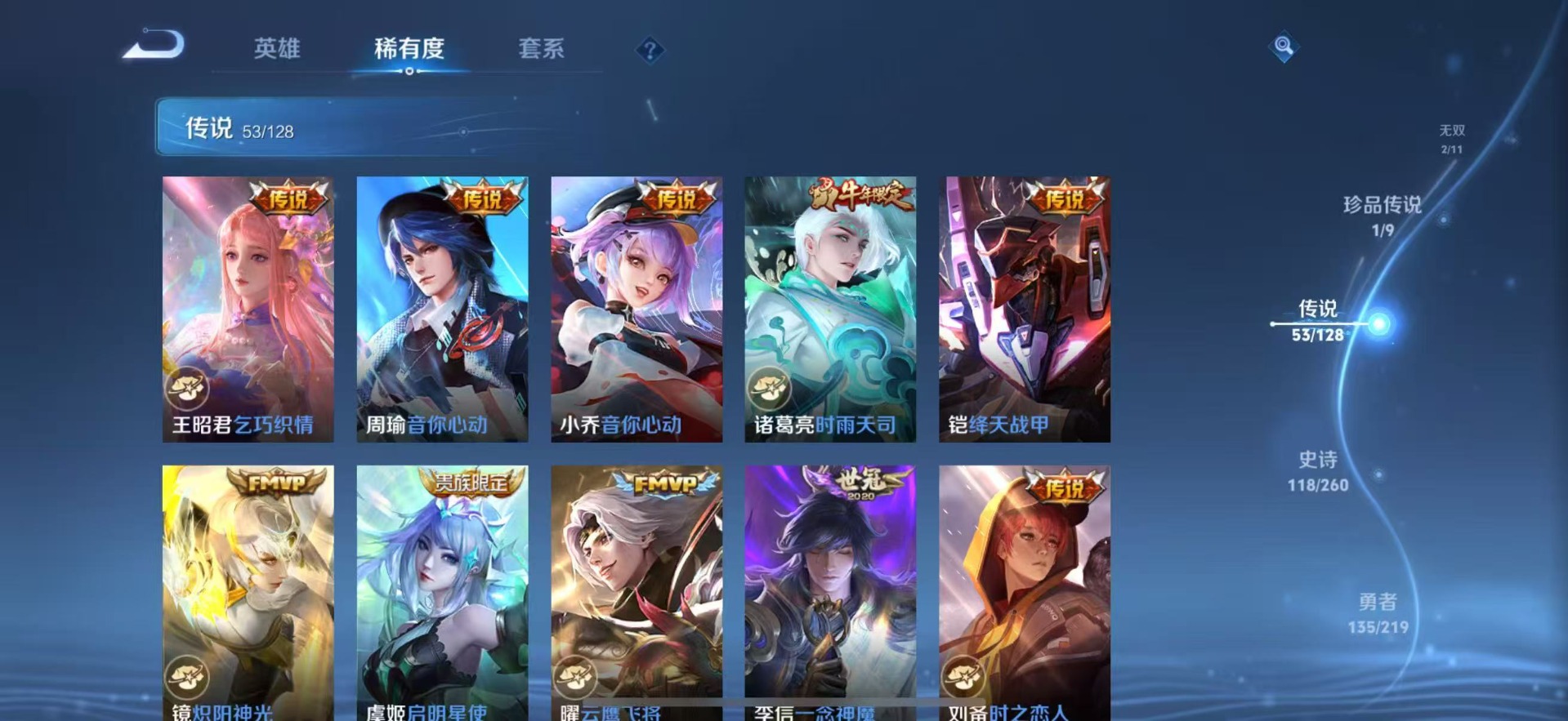 - PX_2058716-性别: 男号 贵族等级: V7 英雄数: 121 皮肤数: 256 荣耀水晶: 天鹅之梦,杀手不太冷 传说皮: 云霓雀翎,音你心动-小乔,山海·炽霜斩,山海·琳琅生 限定皮: 遇见飞天,李小龙,梁祝,白晶晶,天狼溯光者,蜜橘之夏,冰霜恋舞曲,如梦令-嫦娥,纯白花嫁,一生所爱,霸王别姬-虞姬,高山流水,匿光追影者,傲雪梅枪,百木心枪,玉兔公主,五谷丰年,鸣野蒿