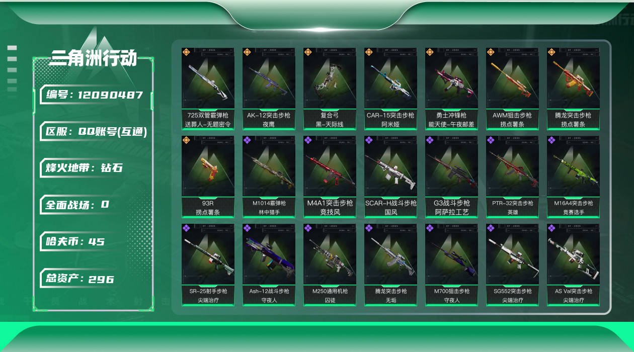 [12090487]总资产:296.3M 3干员外观 8传说枪械 哈夫币:45.231K 顶级安全箱(3×3)9.15号到期 可二次 可修改实名 优质装备:顶级安全箱(3x3) 烽火地带段位:钻石 全面战场段位:军士长 传说武器皮肤:AWM狙击步枪-捞点薯条,腾龙突击步枪-捞点薯条,93R-捞点薯条,勇士冲锋枪-能天使-午夜邮差,复合弓-黑-天际线,725双管霰弹枪-送葬人-无题密令,CAR-15突击步枪-阿米娅,AK-12突击步枪-夜鹰 史诗武器皮肤:AUG突击步枪-蝮蛇,SG552突击步枪-尖端治疗,M1014霰弹枪-林中猎手,PKM通用机枪-守夜人,AS Val突击步枪-尖端治疗,M700狙击步枪-守夜人,Ash-12战斗步枪-守夜人,SR-25射手步枪-尖端治疗,MP5冲锋枪-深海恐惧,AKM突击步枪-林中猎手,M16A4突击步枪-竞赛选手,M250通用机枪-囚徒,SV-98狙击步枪-林中猎手,PTR-32突击步枪-英雄,SV-98狙击步枪-囚徒,腾龙突击步枪-无垢,MP7冲锋枪-无垢,PSG-1射手步枪-无垢,SVD狙击步枪-荒野求生,SR-3M紧凑突击步枪-荒野求生,PKM通用机枪-荒野求生,M4A1突击步枪-竞技风,SCAR-H战斗步枪-国风,G3战斗步枪-阿萨拉工艺,SVD狙击步枪-阿萨拉工艺 干员外观:无名-夜鹰,露娜-黑·天际线,蛊-能天使·午夜邮差