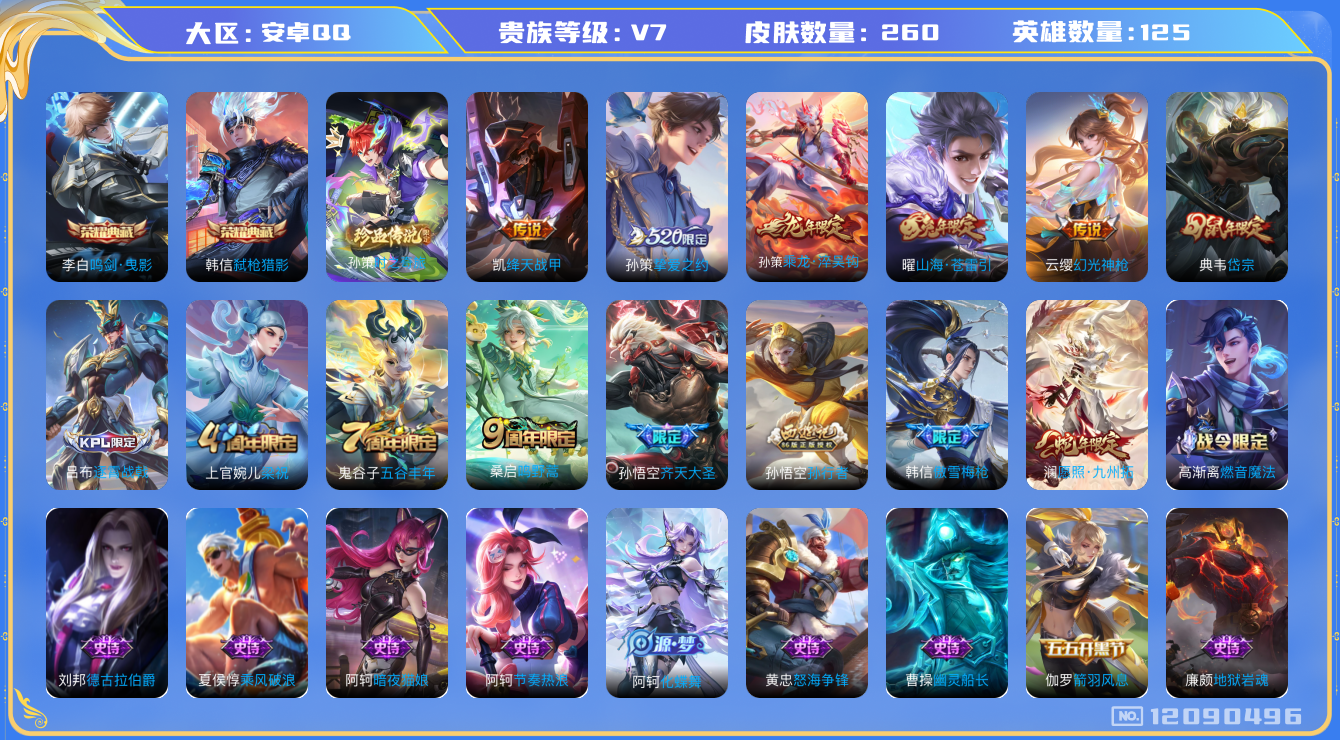 [12090496]V7 2典藏 1珍品传说 8传说 125英雄 260皮肤 可修改实名 优质装备:鸣剑·曳影,弑枪猎影(韩信典藏),绛天战甲(鸡嘴战神),挚爱之约,山海·苍雷引(电光曜子) 珍品传说:时之奇旅-孙策 传说皮:乘龙·淬吴钩(孙策年限),幻光神枪 珍宝阁皮:妄想食味,蔷薇恋人 限定皮:愿照·九州拓(澜年限),逐霄战戟,鸣野蒿,傲雪梅枪,齐天大圣,五谷丰年,梁祝,岱宗(典韦年限),孙行者 史诗皮:鸭鸭历险记-刘禅,器灵·浮梦炉,化蝶舞,灵蛊蚀心,星界战将,谪仙醉月,龙之律动,石田雨龙,百相守梦-周瑜,茶境仙,怒海争锋,破空之剑,蒙犽顽岩魄,琥珀纪元伽罗,百相守梦-百里守约,织梦人,白龙吟,特工魅影,江河有灵,雪夜绮愿(周瑜),百解令(蒙犽),高渐离燃音魔法,蒙恬荣光圣徽,冰冠公主,青蛇,电玩·爆裂旋风,暗夜猫娘,猫狗日记-孙策,时之恋人-孙尚香,节奏热浪,女仆咖啡,水果甜心,星夜王子,功夫厨神,德古拉伯爵,暗隐猎兽者,幽灵船长,鬼剑武藏,心灵战警,舞动绿茵,地狱岩魂,纤云弄巧,繁星吟游(呼啦呼啦),拒霜思,缤纷独角兽,乘风破浪,逐浪之夏,水晶猎龙者,箭羽风息,金属风暴,原初追逐者,圣诞狂欢,圣诞恋歌,鹰眼统帅,暗夜贵公子,魅力维加斯,无心,未来纪元-赵云