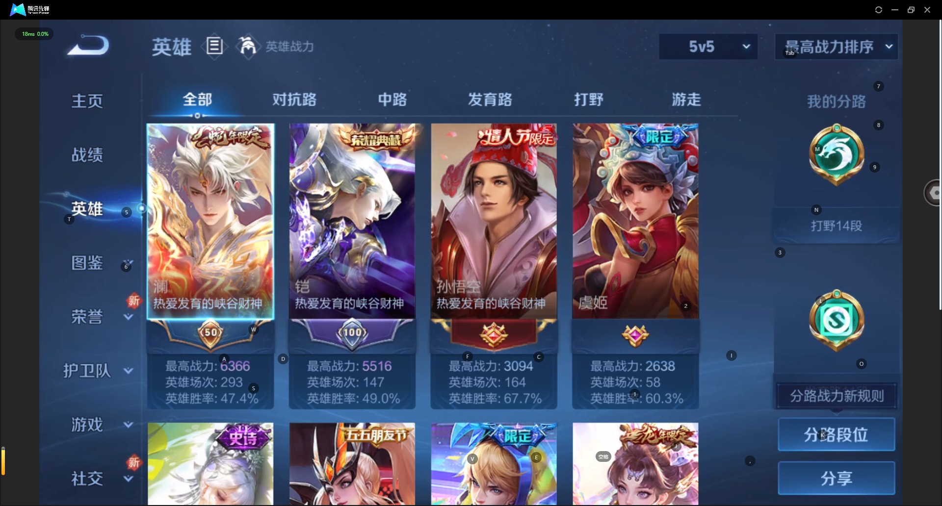 - PX_2094774-贵族等级: V5 英雄数: 94 皮肤数: 50 传说皮: 霜月吟,澜逐花归海