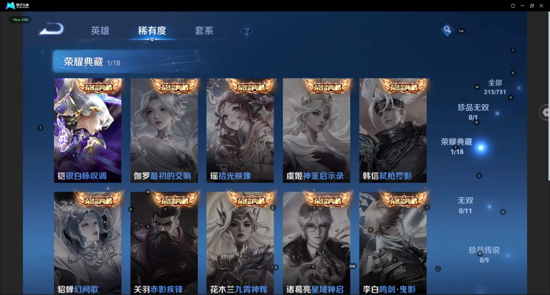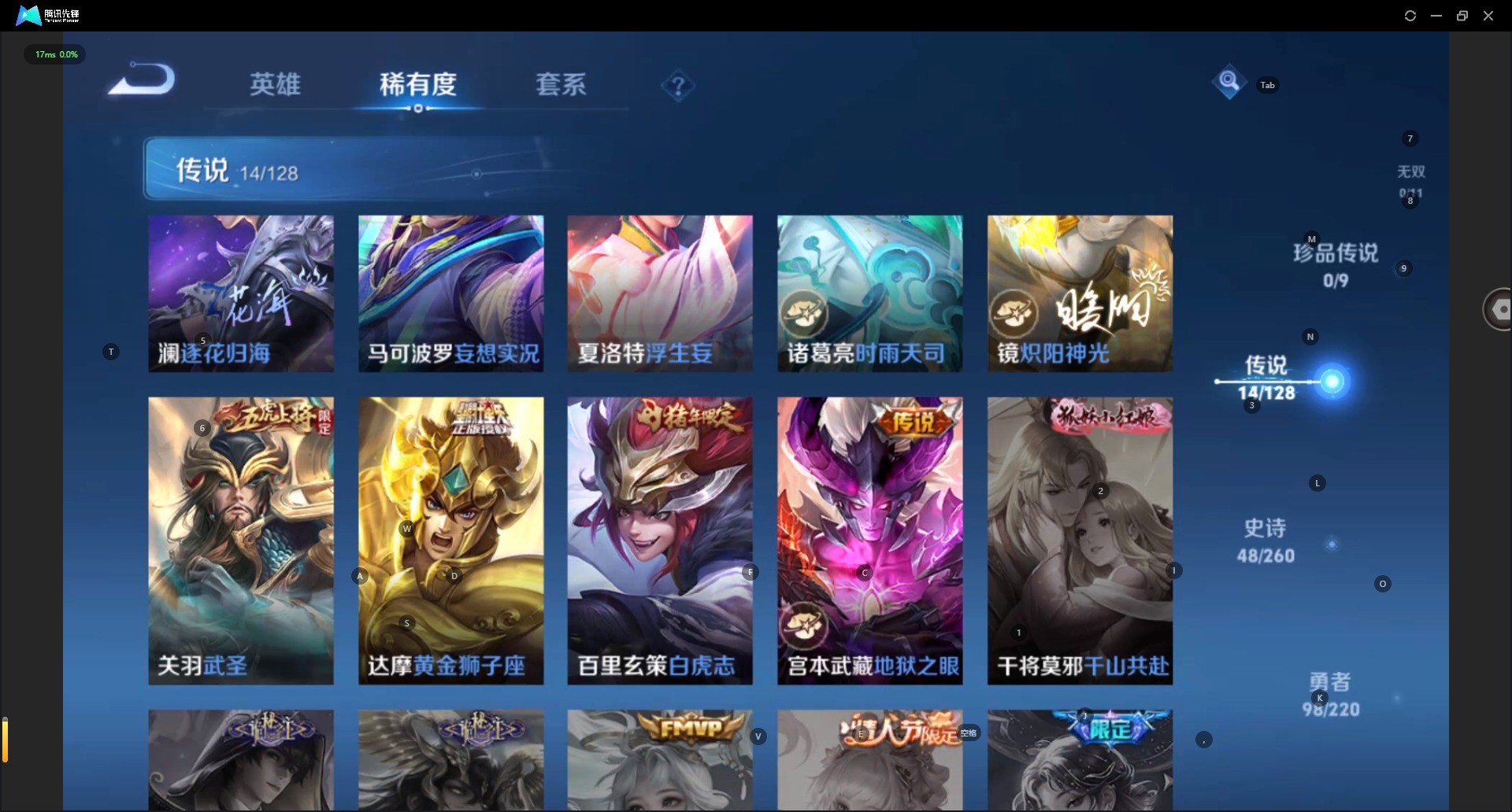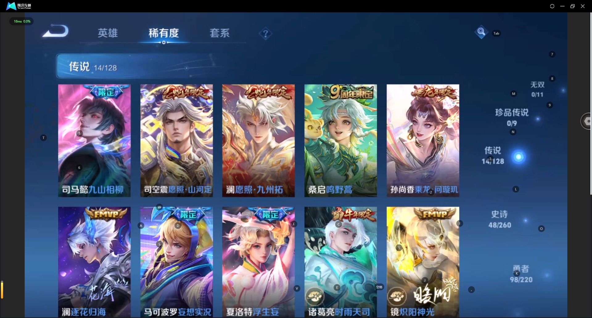 - [12176004]V8 1典藏 17传说 126英雄 251皮肤 可修改实名 优质装备:全息碎影(猴子典藏),猫影幻舞,久胜战神,炽阳神光,一念神魔,末日机甲-孙尚香(绿蚂蚱),零号·赤焰,玄雷天君 传说皮:乘龙·铭钟鼎(赵云年限),幻光神枪 珍宝阁皮:妄想食味,万物之道,优雅恋人 限定皮:愿照·九州拓(澜年限),愿照·山河定(司空震年限),至尊宝,白虎志(电光耗子),凤求凰(白切鸡),太华(伽罗年限),武陵仙君(小桃花),时之彼端,白晶晶,时雨天司(水龙头),神威(电光马子),飞衡(韩信年限),遇见飞天,高山流水,五谷丰年,梁祝,龙胆,烈魂,岱宗(典韦年限),天狼溯光者,天狼征服者,李小龙,逐梦之影,朱雀志(守约年限),辉光之辰,孙行者,猪悟能,大圣娶亲,青春决赛季 史诗皮:器灵·浮梦炉,龙之律动,石田雨龙,百相守梦-黄忠,芈月浮光幕影,蔬乡物语(鲁班七号),电玩小子(小书包),黄金分割率,特工魅影,千年之狐,魅语,晚萤,偶像歌手,龙骑士(小龙虾),末日机甲-吕布,猫狗日记-孙策,时之恋人-孙尚香,乱世虎臣,节奏热浪,修罗,女仆咖啡,摇滚巨星,水果甜心,绅士熊喵,天才门将,星夜王子,功夫厨神,德古拉伯爵,暗隐猎兽者,幽灵船长,鬼剑武藏,心灵战警,地狱岩魂,纤云弄巧,繁星吟游(呼啦呼啦),缤纷独角兽,乘风破浪,逐浪之夏,水晶猎龙者,曙光守护者,箭羽风息,金属风暴,圣诞狂欢,鹰眼统帅,魅力维加斯