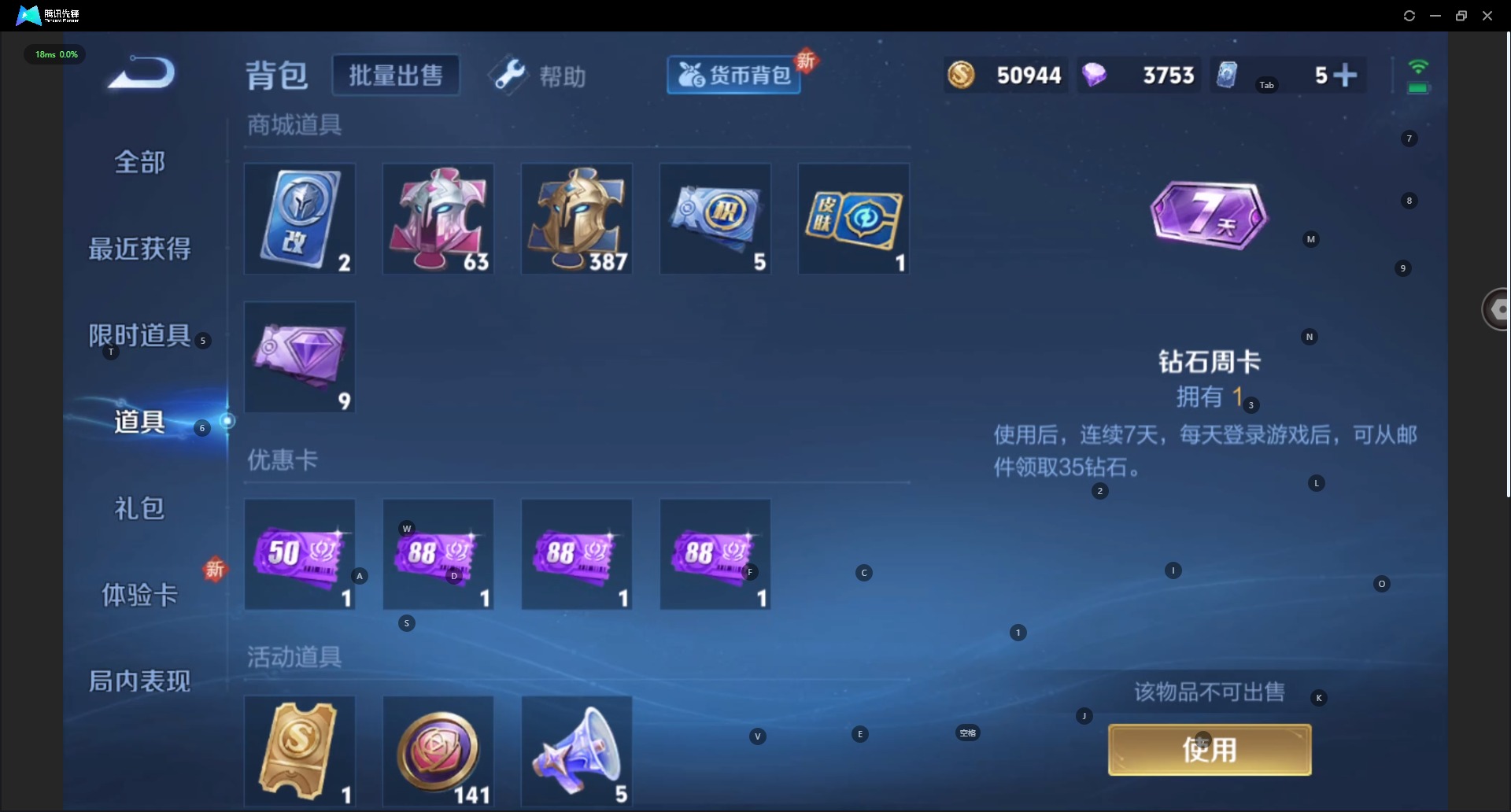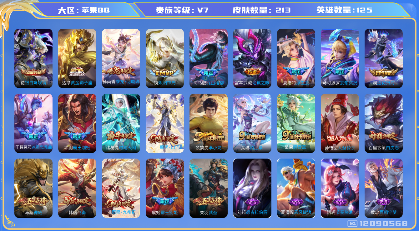 - PX_2095067-实名: 可修改 贵族等级: V7 英雄数: 124 皮肤数: 114 传说皮: 冠军飞将,黄金白羊座,猫影幻舞,超时空战士-狄仁杰,山海·苍雷引,乘龙·淬吴钩 限定皮: 御风骁将,龙胆,烈魂,孙行者,五谷丰年,神器·万象笔,山海·玄木吟