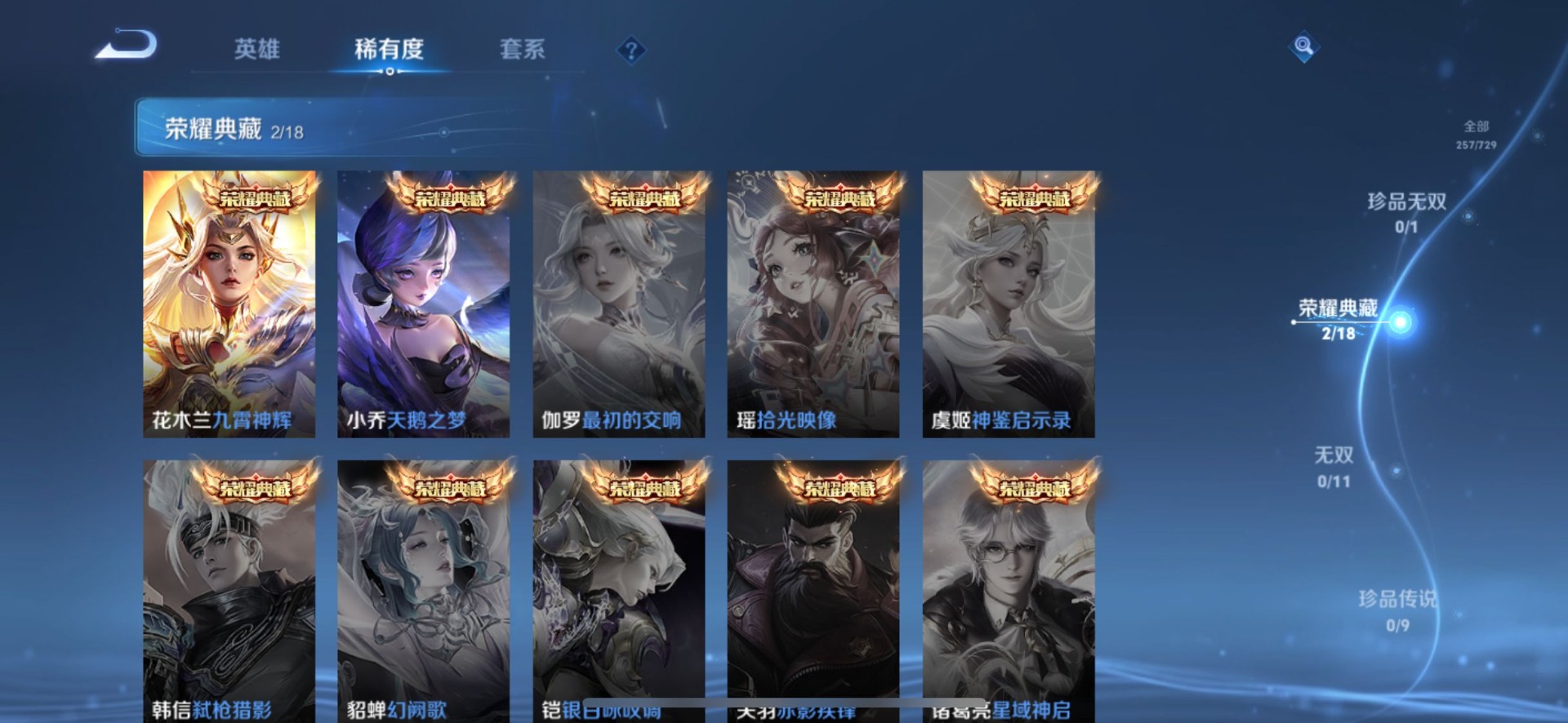 夏侯惇朔风刀,老夫子醍醐杖,盾山御銮,项羽苍威无极,镜青焰无极,元歌云间偶戏,裴擒虎擒涛扼浪,鲁班大师探海日志,明世隐疑决卦,鬼谷子原初探秘者,张良古海寻踪,桑启海盐诗旅,嬴政白昼王子,狄仁杰万华元夜,程咬金演武夺筹,李元芳银河之约,李元芳云中旅人,弈星混沌棋,米莱狄御霄,钟馗驱傩正仪