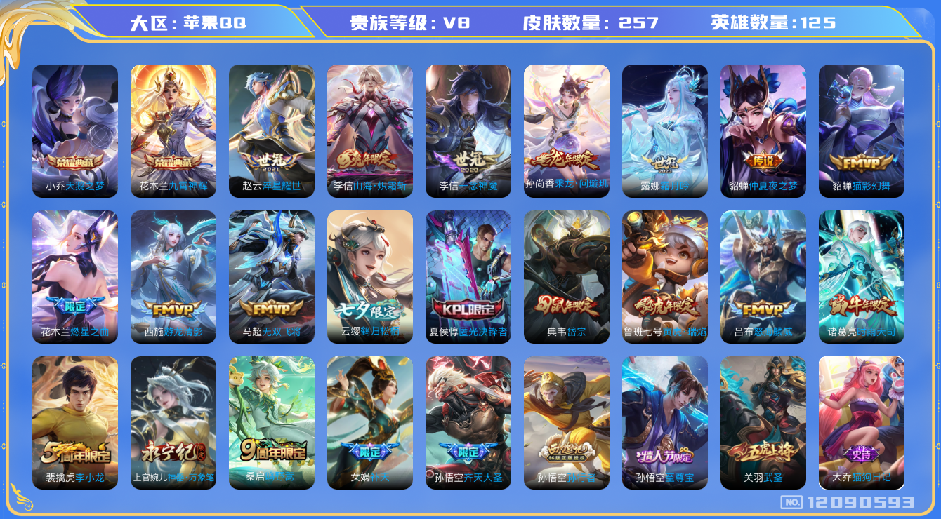 [12090593]V8 2典藏 19传说 125英雄 257皮肤 可修改实名 优质装备:天鹅之梦(小乔典藏),九霄神辉(木兰典藏),猫影幻舞,一念神魔,仲夏夜之梦(大飞蛾),游龙清影(小青龙),淬星耀世,无双飞将,山海·炽霜斩(李信年限),燃星之曲,鹤归松栖(云缨),霜月吟 传说皮:乘龙·问璇玑(孙尚香年限) 珍宝阁皮:万物之道,蔷薇恋人 限定皮:鸣野蒿,至尊宝,补天,时雨天司(水龙头),齐天大圣,匿光决锋者,怒海麟威,武圣,岱宗(典韦年限),李小龙,孙行者,寅虎·瑞焰(虎皮蛋子),神器·万象笔 史诗皮:鸭鸭历险记-刘禅,龙之律动,石田雨龙,破空之剑,蒙犽顽岩魄,决胜骁骑,蔬乡物语(鲁班七号),紫霞仙子,苍穹之光,电玩小子(小书包),特工魅影,千年之狐,江河有灵,鹤归松栖(赵怀真),百解令(蒙犽),高渐离燃音魔法,冰冠公主,青蛇,偶像歌手,电玩·爆裂旋风,末日机甲-吕布,猫狗日记-孙策,猫狗日记-大乔,时之恋人-孙尚香,乱世虎臣,节奏热浪,女仆咖啡,摇滚巨星,水果甜心,天才门将,心灵骇客,功夫厨神,暗隐猎兽者,幽灵船长,鬼剑武藏,地狱岩魂,纤云弄巧,拒霜思,缤纷独角兽,乘风破浪,逐浪之夏,水晶猎龙者,曙光守护者,金属风暴,圣诞狂欢,圣诞恋歌,鹰眼统帅,魅力维加斯,未来纪元-赵云