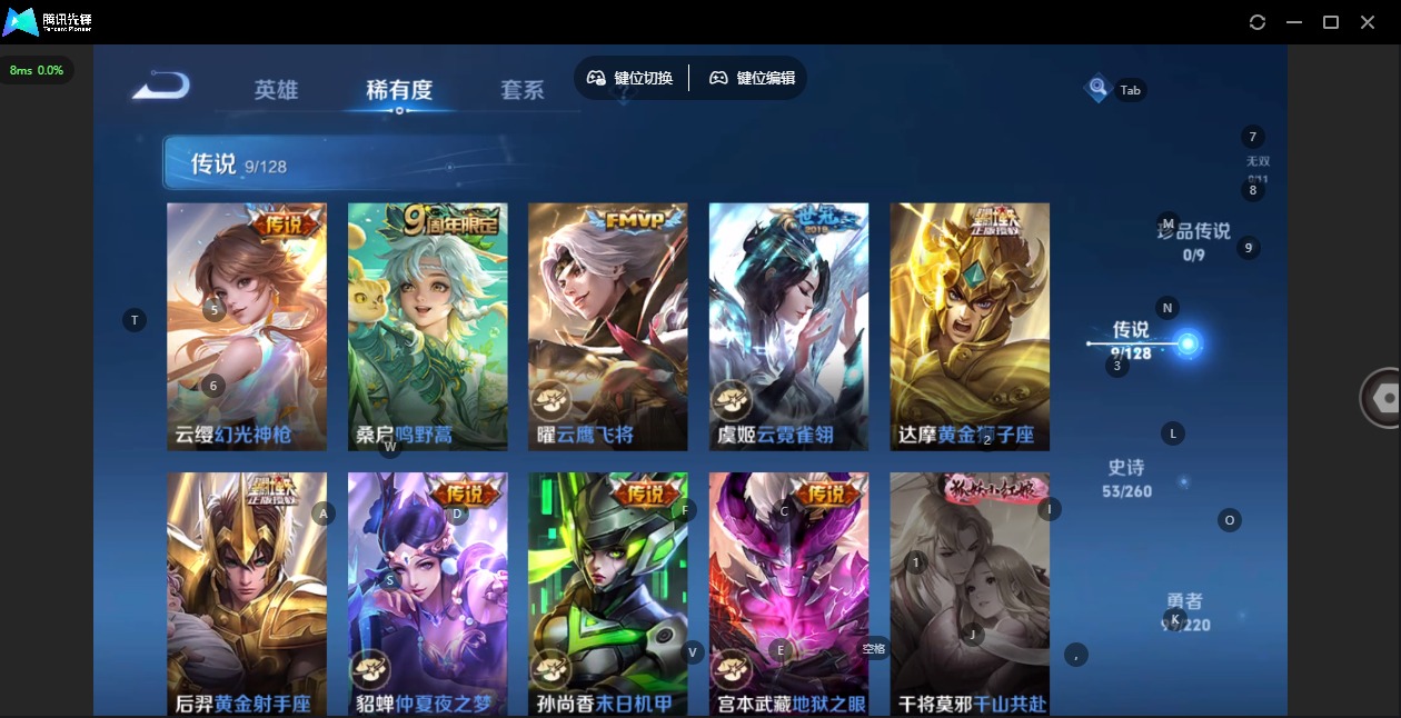 - [12006657]V8 3典藏 10传说 124英雄 255皮肤 可修改实名 优质装备:星空梦想(太空人),幻阙歌(貂蝉典藏),弑枪猎影(韩信典藏),零号·赤焰,淬星耀世,超时空战士-狄仁杰,涂山容容 传说皮:典韦战鼓燎原 珍宝阁皮:万物之道,优雅恋人,蔷薇恋人,玩趣恶龙 限定皮:愿照·岁时盈(虞姬年限),鸣野蒿,凤求凰(白切鸡),傲雪梅枪,时雨天司(水龙头),高山流水,齐天大圣,游园惊梦,梁祝,御风骁将(吕布年限),李小龙,孙行者,乒乒小将 史诗皮:器灵·浮梦炉,星界战将,谪仙醉月,石田雨龙,茶境仙,破空之剑,琥珀纪元伽罗,蔬乡物语(鲁班七号),百相守梦-百里守约,百相守梦-黄忠,紫霞仙子,苍穹之光,特工魅影,千年之狐,江河有灵,匿光侦查者,高渐离燃音魔法,蒙恬荣光圣徽,冰冠公主,青蛇,偶像歌手,晚萤,百相守梦(刘备),暗夜猫娘,龙骑士(小龙虾),末日机甲-吕布,猫狗日记-孙策,乱世虎臣,节奏热浪,修罗,女仆咖啡,水果甜心,绅士熊喵,星夜王子,心灵骇客,功夫厨神,德古拉伯爵,暗隐猎兽者,幽灵船长,鬼剑武藏,乐园奇幻夜,天秀·启明,舞动绿茵,纤云弄巧,乘风破浪,逐浪之夏,水晶猎龙者,曙光守护者,热力回旋,唤灵魅影,金属风暴,原初追逐者,圣诞狂欢,圣诞恋歌,鹰眼统帅,魅力维加斯,黎明之约,未来纪元-赵云