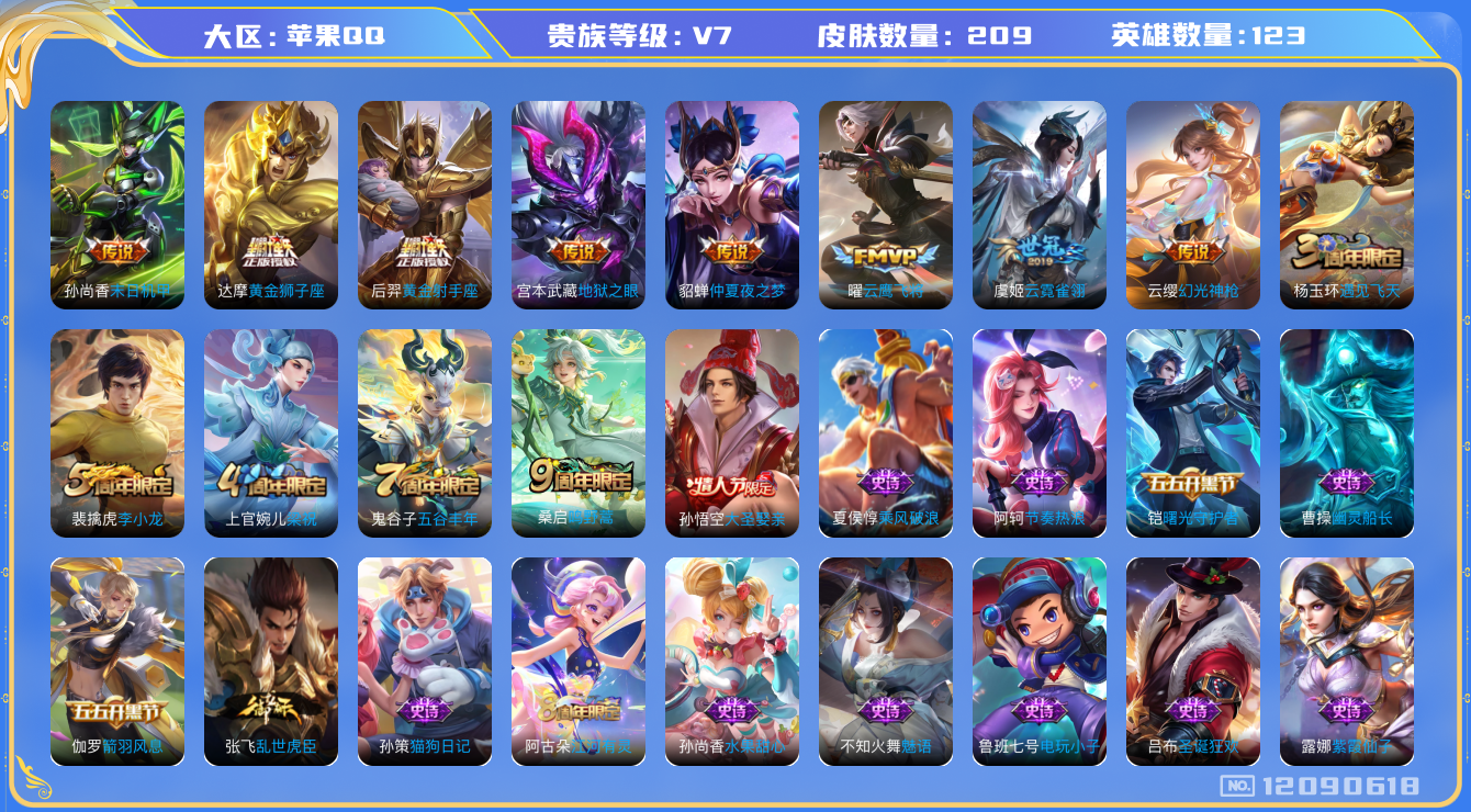 [12090618]V7 9传说 123英雄 209皮肤 可修改实名 优质装备:黄金狮子座,黄金射手座,云鹰飞将(小将军),云霓雀翎,末日机甲-孙尚香(绿蚂蚱),仲夏夜之梦(大飞蛾),地狱之眼,涂山容容 传说皮:幻光神枪 珍宝阁皮:妄想食味,玩趣恶龙 限定皮:鸣野蒿,遇见飞天,五谷丰年,梁祝,李小龙,大圣娶亲 史诗皮:紫霞仙子,电玩小子(小书包),白龙吟,黄金分割率,特工魅影,千年之狐,江河有灵,魅语,蒙恬荣光圣徽,无限星赏官,冰冠公主,偶像歌手,晚萤,龙骑士(小龙虾),猫狗日记-孙策,乱世虎臣,节奏热浪,修罗,摇滚巨星,水果甜心,天才门将,心灵骇客,功夫厨神,暗隐猎兽者,幽灵船长,鬼剑武藏,心灵战警,舞动绿茵,纤云弄巧,繁星吟游(呼啦呼啦),乘风破浪,逐浪之夏,水晶猎龙者,曙光守护者,箭羽风息,金属风暴,圣诞狂欢,鹰眼统帅,暗夜贵公子,无心