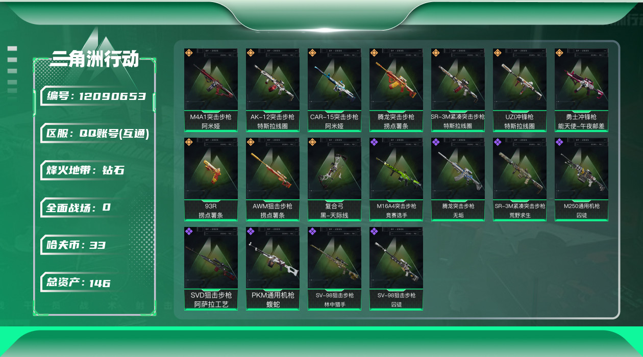 [12090653]总资产:146.9M 10传说枪械 哈夫币:33.522K 可二次 可修改实名 烽火地带段位:钻石 全面战场段位:军士长 传说武器皮肤:93R-捞点薯条,AWM狙击步枪-捞点薯条,腾龙突击步枪-捞点薯条,AK-12突击步枪-特斯拉线圈,CAR-15突击步枪-阿米娅,SR-3M紧凑突击步枪-特斯拉线圈,UZI冲锋枪-特斯拉线圈,勇士冲锋枪-能天使-午夜邮差,复合弓-黑-天际线,M4A1突击步枪-阿米娅 史诗武器皮肤:PKM通用机枪-蝮蛇,M16A4突击步枪-竞赛选手,SR-3M紧凑突击步枪-荒野求生,SV-98狙击步枪-林中猎手,M250通用机枪-囚徒,SV-98狙击步枪-囚徒,腾龙突击步枪-无垢,SVD狙击步枪-阿萨拉工艺