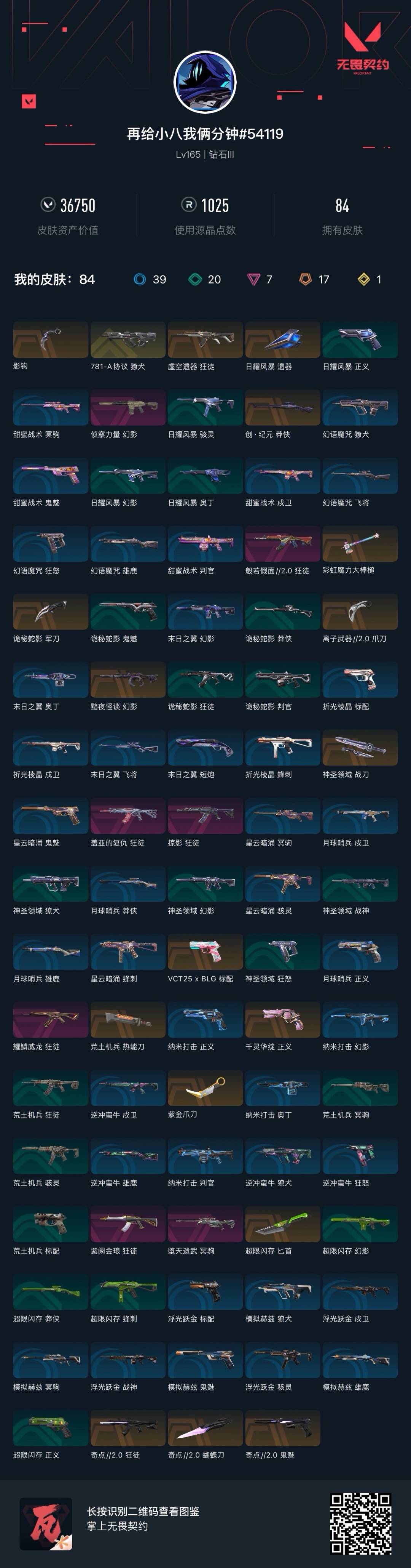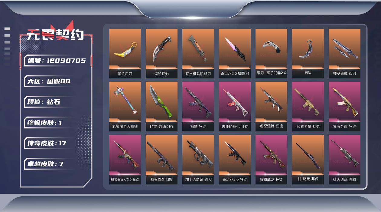 [12090705]17橙皮 1金皮 7紫皮 84皮肤 27英雄 133卡面 1025已用源晶 钻石 优质装备:奇点//2.0套装,狂徒-掠影,狂徒-紫阙金琅,狂徒-盖亚的复仇,幻影-侦察力量,獠犬-781-A协议,冥驹-堕天遗武,正义-千灵华绽,幻影-黯夜怪谈,狂徒-奇点//2.0,紫金爪刀,狂徒-耀鳞威龙,彩虹魔力大棒槌,匕首-超限闪存,鬼魅-奇点//2.0,蝴蝶刀-奇点//2.0,荒土机兵热能刀,神圣领域 战刀,离子武器2.0 爪刀,诡秘蛇影,影钩 佩枪皮肤:标配-VCT25xBLG 步枪皮肤:狂徒-般若假面//2.0,狂徒-虚空遗器 狙击枪皮肤:莽侠-创·纪元