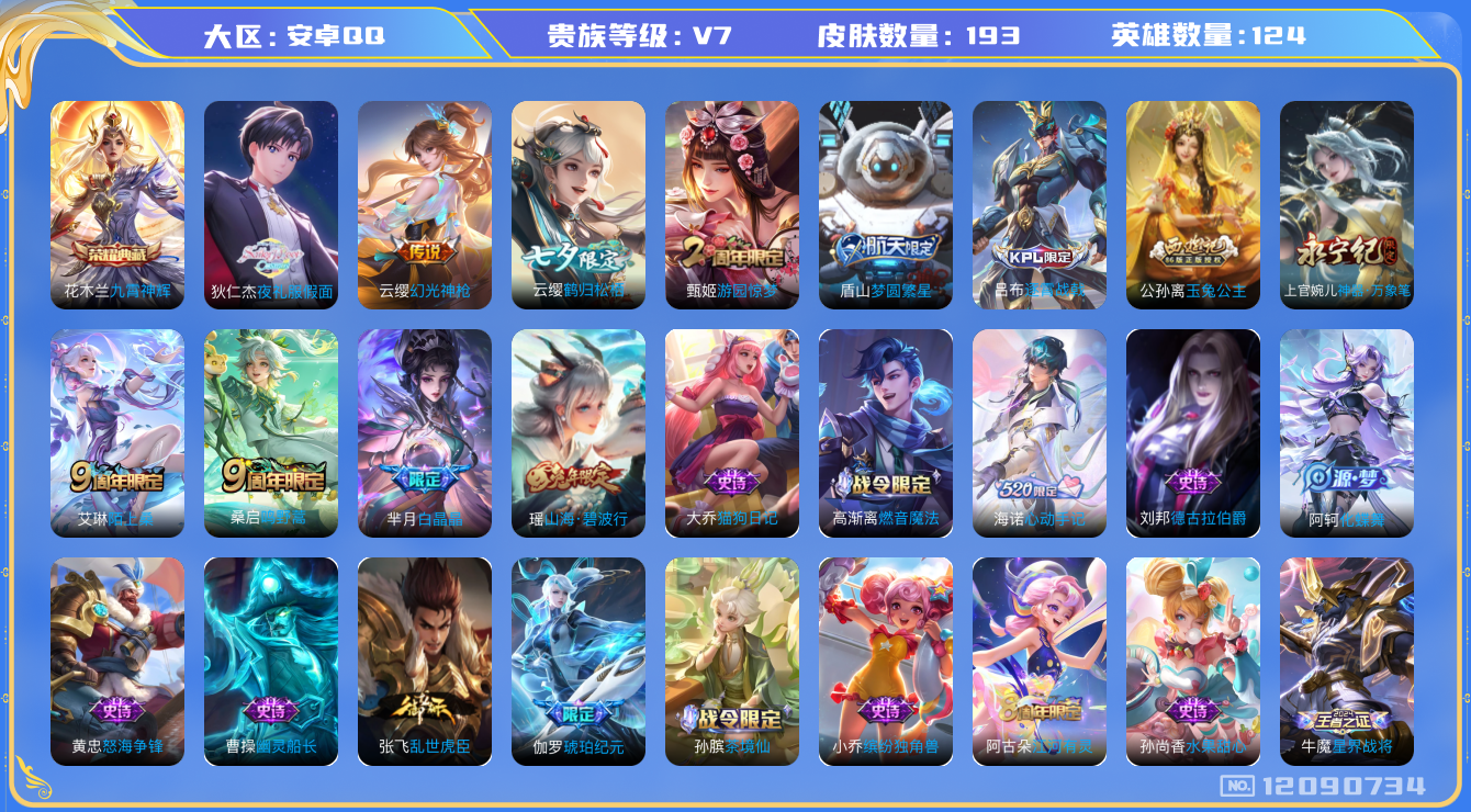 [12090734]V7 1典藏 4传说 124英雄 193皮肤 可修改实名 优质装备:九霄神辉(木兰典藏),鹤归松栖(云缨),夜礼服假面,涂山容容 传说皮:幻光神枪 珍宝阁皮:女武神 限定皮:逐霄战戟,陌上桑,鸣野蒿,白晶晶,山海·碧波行(瑶年限),游园惊梦,玉兔公主,神器·万象笔,梦圆繁星 史诗皮:化蝶舞,星界战将,茶境仙,怒海争锋,破空之剑,涂山红红,蒙犽顽岩魄,埋骨钱,海诺心动手记,琥珀纪元伽罗,上官婉儿群星魔术团,奇遇星旅,蔬乡物语(鲁班七号),遇见神鹿,特工魅影,千年之狐,江河有灵,百解令(蒙犽),高渐离燃音魔法,蒙恬荣光圣徽,偶像歌手,电玩·爆裂旋风,猫狗日记-大乔,乱世虎臣,女仆咖啡,水果甜心,绅士熊喵,天才门将,功夫厨神,德古拉伯爵,幽灵船长,鬼剑武藏,暗渊魔法,心灵战警,舞动绿茵,纤云弄巧,拒霜思,缤纷独角兽,水晶猎龙者,鹰眼统帅,魅力维加斯