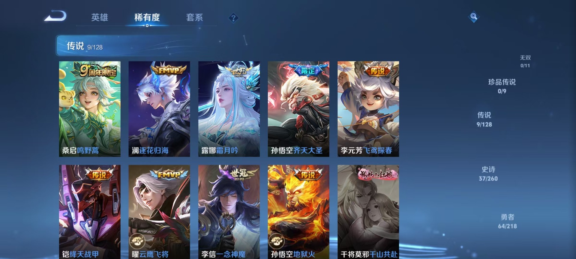 - [11913641]V8 1典藏 1珍品传说 11传说 125英雄 331皮肤 可修改实名 优质装备:银白咏叹调(倪克斯侍卫),黑崎一护,云鹰飞将(小将军),久胜战神,零号·赤焰,超时空战士-狄仁杰,浮生妄,鹤羽星尊 珍宝阁皮:女武神,玩趣恶龙 限定皮:至尊宝,白虎志(电光耗子),神威(电光马子),飞衡(韩信年限),降魔,五谷丰年,天狼运算者,游园惊梦,梁祝,逐梦之星,祈雪灵祝(雪兔子),李小龙,逐梦之影,永曜之星,辉光之辰,默契交锋-花木兰,猪悟能,大圣娶亲,引擎之心,青春决赛季,冰霜恋舞曲,寅虎·赤拳(老虎年限),时之祈愿-云中君,冰霜神祇 史诗皮:龙之律动,石田雨龙,琥珀纪元伽罗,遇见神鹿,紫霞仙子,苍穹之光,电玩小子(小书包),白龙吟,黄金分割率,特工魅影,千年之狐,江河有灵,百解令(蒙犽),高渐离燃音魔法,匿光破解者,冰冠公主,偶像歌手,晚萤,电玩·爆裂旋风,暗夜猫娘,银翎春语,龙骑士(小龙虾),末日机甲-吕布,猫狗日记-孙策,猫狗日记-大乔,时之恋人-孙尚香,乱世虎臣,节奏热浪,女仆咖啡,摇滚巨星,水果甜心,绅士熊喵,天才门将,星夜王子,心灵骇客,功夫厨神,德古拉伯爵,暗隐猎兽者,幽灵船长,鬼剑武藏,心灵战警,舞动绿茵,地狱岩魂,纤云弄巧,繁星吟游(呼啦呼啦),拒霜思,缤纷独角兽,乘风破浪,逐浪之夏,水晶猎龙者,曙光守护者,箭羽风息,金属风暴,圣诞狂欢,圣诞恋歌,鹰眼统帅,暗夜贵公子,魅力维加斯,滕王阁序,无心,未来纪元-赵云,玫瑰异探