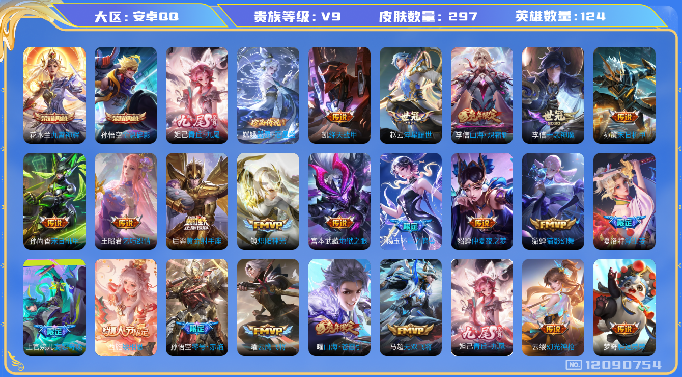 [12090754]V9 2典藏 1无双 1珍品传说 29传说 124英雄 297皮肤 可修改实名 优质装备:全息碎影(猴子典藏),九霄神辉(木兰典藏),青丘·九尾(妲己无双),器灵·落星盏,黄金射手座,云鹰飞将(小将军),绛天战甲(鸡嘴战神),猫影幻舞,炽阳神光,一念神魔,末日机甲-孙尚香(绿蚂蚱),仲夏夜之梦(大飞蛾),零号·赤焰,地狱之眼,胖达荣荣,乞巧织情,淬星耀世,末日机甲-孙策,无双飞将,山海·炽霜斩(李信年限),山海·苍雷引(电光曜子),浮生妄,青丘·九尾,妄想奇谈 传说皮:续相思,星之鸣奏,幻光神枪 珍宝阁皮:玩趣恶龙 限定皮:愿照·岁时盈(虞姬年限),愿照·众生和(妲己年限),愿照·千秋盛(女娲年限),鸣野蒿,至尊宝,傲雪梅枪,神威(电光马子),飞衡(韩信年限),齐天大圣,降魔,五谷丰年,青龙志(铠年限),梁祝,御风骁将(吕布年限),龙胆,朱雀志(守约年限),孙行者,大圣娶亲,引擎之心,乒乒小将,美猴王,深海之息(深海大菠萝),山海·玄木吟(马可年限) 史诗皮:器灵·浮梦炉,龙之律动,紫霞仙子,苍穹之光,电玩小子(小书包),黄金分割率,特工魅影,千年之狐,永昼,江河有灵,百解令(蒙犽),蒙恬荣光圣徽,无限星赏官,冰冠公主,青蛇,偶像歌手,白蛇,晚萤,末日机甲-吕布,猫狗日记-孙策,猫狗日记-大乔,时之恋人-孙尚香,乱世虎臣,节奏热浪,修罗,女仆咖啡,摇滚巨星,水果甜心,绅士熊喵,天才门将,星夜王子,心灵骇客,功夫厨神,德古拉伯爵,暗隐猎兽者,幽灵船长,鬼剑武藏,心灵战警,舞动绿茵,地狱岩魂,缤纷独角兽,乘风破浪,逐浪之夏,月团寄思,水晶猎龙者,曙光守护者,箭羽风息,金属风暴,原初追逐者,圣诞狂欢,圣诞恋歌,鹰眼统帅,暗夜贵公子,魅力维加斯,赏金猎手,天秀·音浪,千筹问战,无心,未来纪元-赵云