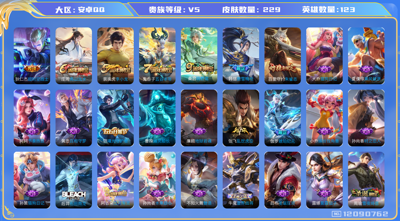 [12090762]V5 2传说 123英雄 229皮肤 可修改实名 优质装备:超时空战士-狄仁杰 珍宝阁皮:胡桃夹子,蔷薇恋人 限定皮:鸣野蒿,傲雪梅枪,高山流水,五谷丰年,李小龙,朱雀志(守约年限) 史诗皮:星界战将,石田雨龙,琥珀纪元伽罗,百相守梦-黄忠,紫霞仙子,特工魅影,千年之狐,江河有灵,雪夜绮愿(周瑜),魅语,百解令(蒙犽),蒙恬荣光圣徽,猫狗日记-孙策,猫狗日记-大乔,时之恋人-孙尚香,乱世虎臣,节奏热浪,修罗,摇滚巨星,水果甜心,绅士熊喵,星夜王子,心灵骇客,功夫厨神,暗隐猎兽者,幽灵船长,鬼剑武藏,心灵战警,地狱岩魂,纤云弄巧,拒霜思,缤纷独角兽,乘风破浪,逐浪之夏,水晶猎龙者,曙光守护者,金属风暴,圣诞狂欢,圣诞恋歌,鹰眼统帅,魅力维加斯