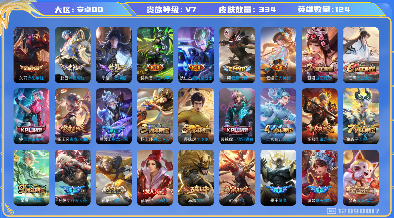 [12090817]V7 1典藏 11传说 124英雄 334皮肤 可修改实名 优质装备:赤影疾锋,云鹰飞将(小将军),一念神魔,末日机甲-孙尚香(绿蚂蚱),淬星耀世,超时空战士-狄仁杰,涂山容容 传说皮:幻光神枪 珍宝阁皮:女武神,玩趣恶龙 限定皮:鸣野蒿,神威(电光马子),飞衡(韩信年限),影龙天霄,遇见飞天,高山流水,齐天大圣,降魔,五谷丰年,冰锋战神,武圣,游园惊梦,梁祝,天狼狩猎者,李小龙,永曜之星,霸王别姬-虞姬,孙行者,大圣娶亲,匿光追影者,寅虎·心曲(虎婆),天降福星 史诗皮:鸭鸭历险记-刘禅,灵蛊蚀心,星界战将,龙之律动,藏狐·褐绒,百相守梦-周瑜,怒海争锋,琥珀纪元伽罗,百相守梦-黄忠,守夜人,苍穹之光,电玩小子(小书包),黄金分割率,特工魅影,千年之狐,江河有灵,魅语,蒙恬荣光圣徽,冰冠公主,偶像歌手,白蛇,晚萤,龙骑士(小龙虾),末日机甲-吕布,猫狗日记-孙策,乱世虎臣,节奏热浪,修罗,女仆咖啡,摇滚巨星,水果甜心,绅士熊喵,天才门将,星夜王子,心灵骇客,功夫厨神,德古拉伯爵,暗隐猎兽者,幽灵船长,鬼剑武藏,心灵战警,舞动绿茵,地狱岩魂,纤云弄巧,繁星吟游(呼啦呼啦),缤纷独角兽,乘风破浪,逐浪之夏,水晶猎龙者,曙光守护者,箭羽风息,金属风暴,原初追逐者,圣诞狂欢,圣诞恋歌,鹰眼统帅,王者之锤,魅力维加斯,黎明之约,未来纪元-赵云