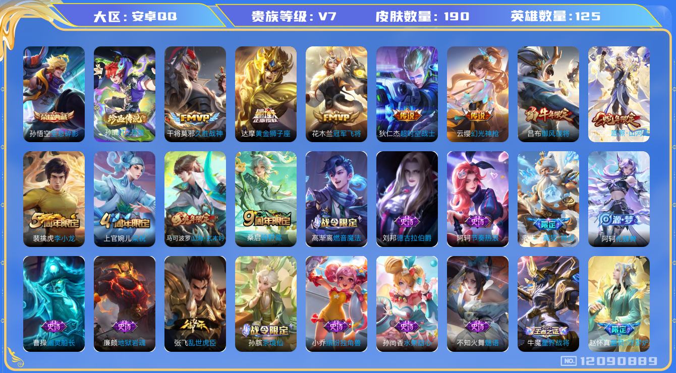 [12090889]V7 1典藏 1珍品传说 7传说 125英雄 190皮肤 可修改实名 优质装备:全息碎影(猴子典藏),黄金狮子座,冠军飞将,久胜战神,超时空战士-狄仁杰 珍品传说:时之奇旅-孙策 传说皮:幻光神枪 珍宝阁皮:妄想食味 限定皮:愿照·山河定(司空震年限),鸣野蒿,梁祝,御风骁将(吕布年限),李小龙,山海·玄木吟(马可年限) 史诗皮:器灵·浮梦炉,化蝶舞,星界战将,谪仙醉月,龙之律动,藏狐·褐绒,茶境仙,破空之剑,紫霞仙子,特工魅影,雪夜绮愿(周瑜),魅语,百解令(蒙犽),高渐离燃音魔法,蒙恬荣光圣徽,无限星赏官,冰冠公主,偶像歌手,龙骑士(小龙虾),末日机甲-吕布,乱世虎臣,节奏热浪,修罗,水果甜心,德古拉伯爵,暗隐猎兽者,幽灵船长,鬼剑武藏,地狱岩魂,纤云弄巧,缤纷独角兽,水晶猎龙者,圣诞狂欢,鹰眼统帅,魅力维加斯