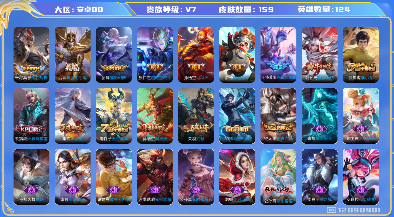 [12090901]V7 9传说 124英雄 159皮肤 可修改实名 女号 优质装备:黄金射手座,猫影幻舞,久胜战神,地狱火,胖达荣荣,超时空战士-狄仁杰,涂山容容 珍宝阁皮:蔷薇恋人 限定皮:凤求凰(白切鸡),五谷丰年,武圣,天狼狩猎者,祈雪灵祝(雪兔子),李小龙,冰霜恋舞曲,美猴王 史诗皮:紫霞仙子,黄金分割率,特工魅影,千年之狐,魅语,无限星赏官,水果甜心,星夜王子,心灵骇客,幽灵船长,鬼剑武藏,纤云弄巧,逐浪之夏,曙光守护者,金属风暴,原初追逐者,圣诞恋歌,鹰眼统帅,王者之锤,暗夜贵公子,魅力维加斯,黎明之约