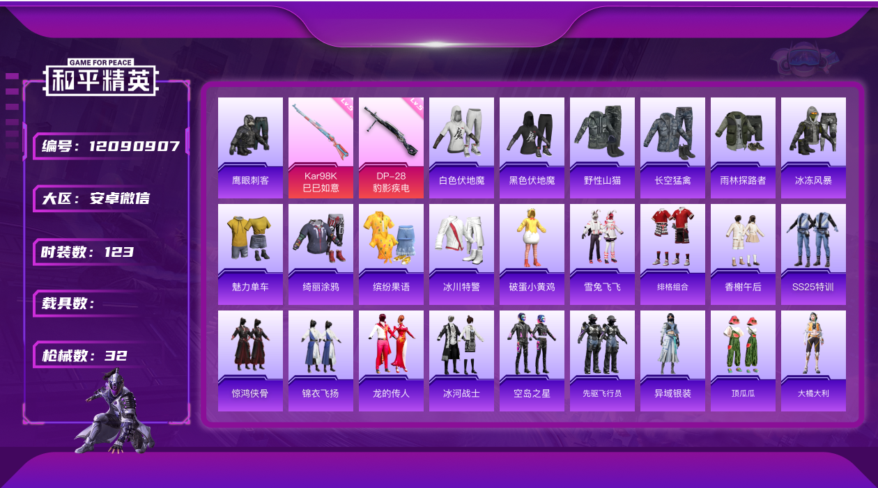 [12090907]2特效枪 可二次 可修改实名 安全保护中 优质装备:Kar98K-巳巳如意 热门装扮:鹰眼刺客 稀有枪皮:DP-28-豹影疾电 五级特效枪:五级Kar98K-巳巳如意,五级DP-28-豹影疾电 紫色装扮:香榭午后,SS31特训套装,冰川特警,SS33特训套装,顶瓜瓜,雪兔飞飞,野性山猫,长空猛禽,雨林探路者,缤纷果语,魅力单车,黑色伏地魔,龙的传人,冰河战士,绮丽涂鸦,白色伏地魔,破蛋小黄鸡,空岛之星,先驱飞行员,异域银装,惊鸿侠骨,SS25特训,锦衣飞扬,大橘大利,SS32特训服(SS32特训套装),绯格组合,冰冻风暴 优质战备:天星战神降落伞,炫光之旅降落伞