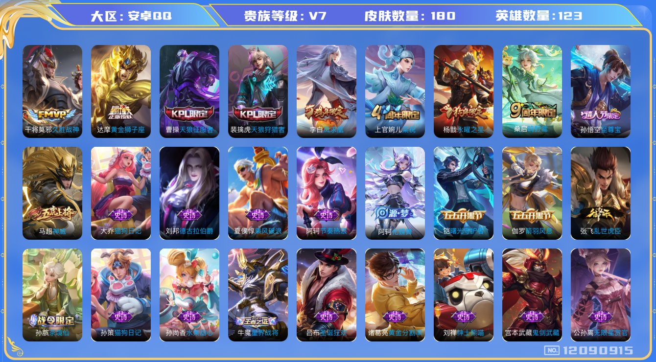 [12090915]V7 5传说 123英雄 180皮肤 可修改实名 优质装备:黄金狮子座,久胜战神 珍宝阁皮:妄想食味 限定皮:鸣野蒿,至尊宝,凤求凰(白切鸡),神威(电光马子),梁祝,天狼狩猎者,天狼征服者,永曜之星 史诗皮:化蝶舞,星界战将,龙之律动,茶境仙,黄金分割率,特工魅影,无限星赏官,偶像歌手,猫狗日记-孙策,猫狗日记-大乔,乱世虎臣,节奏热浪,修罗,水果甜心,绅士熊喵,星夜王子,功夫厨神,德古拉伯爵,暗隐猎兽者,鬼剑武藏,乐园奇幻夜,舞动绿茵,纤云弄巧,繁星吟游(呼啦呼啦),乘风破浪,逐浪之夏,水晶猎龙者,曙光守护者,箭羽风息,金属风暴,原初追逐者,圣诞狂欢,圣诞恋歌,鹰眼统帅,魅力维加斯,黎明之约,未来纪元-赵云