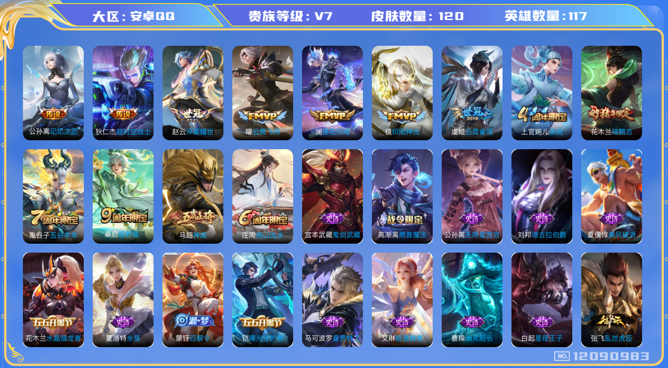 [12090983]V7 8传说 117英雄 120皮肤 可修改实名 优质装备:云鹰飞将(小将军),炽阳神光,云霓雀翎,淬星耀世,超时空战士-狄仁杰,记忆之芯(机甲兔),澜逐花归海 珍宝阁皮:女武神 限定皮:鸣野蒿,神威(电光马子),瑞麟志(木兰年限),高山流水,五谷丰年,梁祝 史诗皮:星界战将,蔬乡物语(鲁班七号),星界特工,紫霞仙子,永昼,江河有灵,匿光侦查者,末日机甲-莱西奥,真我赫兹(百里守约),魅语,百解令(蒙犽),高渐离燃音魔法,无限星赏官,晚萤,末日机甲-吕布,猫狗日记-孙策,时之恋人-孙尚香,乱世虎臣,修罗,天才门将,星夜王子,功夫厨神,德古拉伯爵,幽灵船长,鬼剑武藏,暗渊魔法,拒霜思,缤纷独角兽,乘风破浪,水晶猎龙者,曙光守护者,金属风暴,原初追逐者,圣诞狂欢,魅力维加斯,黎明之约,奇遇舞章,滕王阁序,未来纪元-赵云