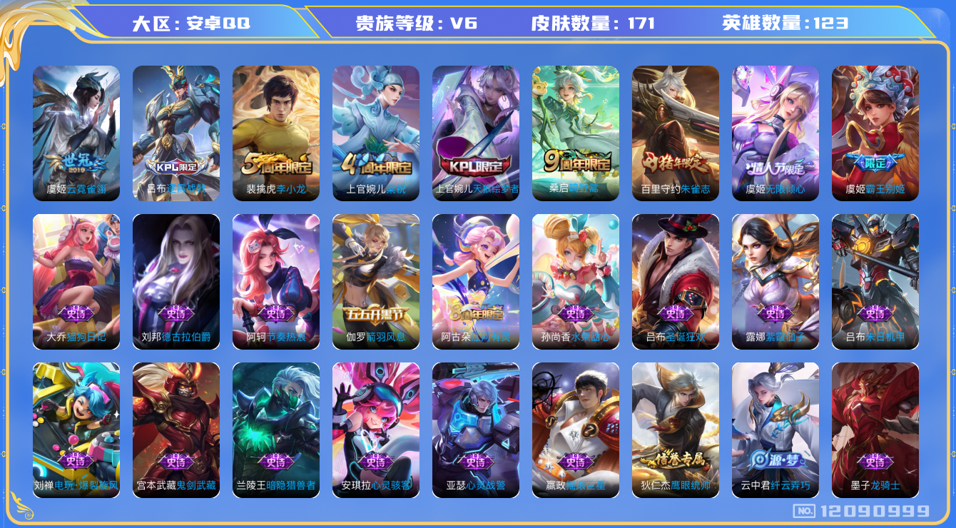 [12090999]V6 3传说 123英雄 171皮肤 可修改实名 优质装备:云霓雀翎 珍宝阁皮:蔷薇恋人,女武神 限定皮:逐霄战戟,鸣野蒿,无限倾心-虞姬,梁祝,天狼绘梦者,李小龙,朱雀志(守约年限),霸王别姬-虞姬 史诗皮:遇见神鹿,紫霞仙子,江河有灵,蒙恬荣光圣徽,电玩·爆裂旋风,龙骑士(小龙虾),末日机甲-吕布,猫狗日记-大乔,节奏热浪,女仆咖啡,摇滚巨星,水果甜心,心灵骇客,德古拉伯爵,暗隐猎兽者,鬼剑武藏,心灵战警,纤云弄巧,繁星吟游(呼啦呼啦),箭羽风息,金属风暴,圣诞狂欢,鹰眼统帅,魅力维加斯
