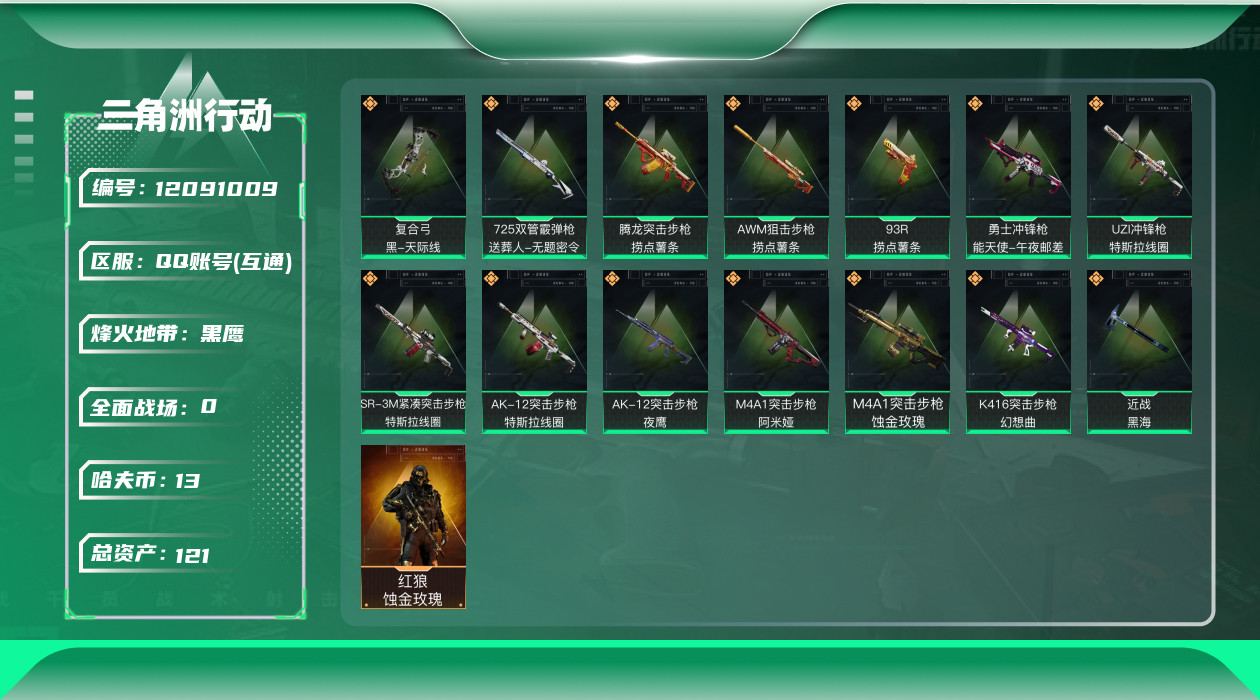 [12091009]总资产:121.5M 1干员外观 1近战传说 14传说枪械 哈夫币:13.416K 高级安全箱(2×3)9.15号到期 可二次 可修改实名 优质装备:近战-黑海 烽火地带段位:黑鹰 全面战场段位:列兵 传说武器皮肤:AK-12突击步枪-夜鹰,93R-捞点薯条,AWM狙击步枪-捞点薯条,腾龙突击步枪-捞点薯条,AK-12突击步枪-特斯拉线圈,SR-3M紧凑突击步枪-特斯拉线圈,UZI冲锋枪-特斯拉线圈,勇士冲锋枪-能天使-午夜邮差,复合弓-黑-天际线,M4A1突击步枪-阿米娅,K416突击步枪-幻想曲,725双管霰弹枪-送葬人-无题密令,M4A1突击步枪-蚀金玫瑰 干员外观:红狼-蚀金玫瑰