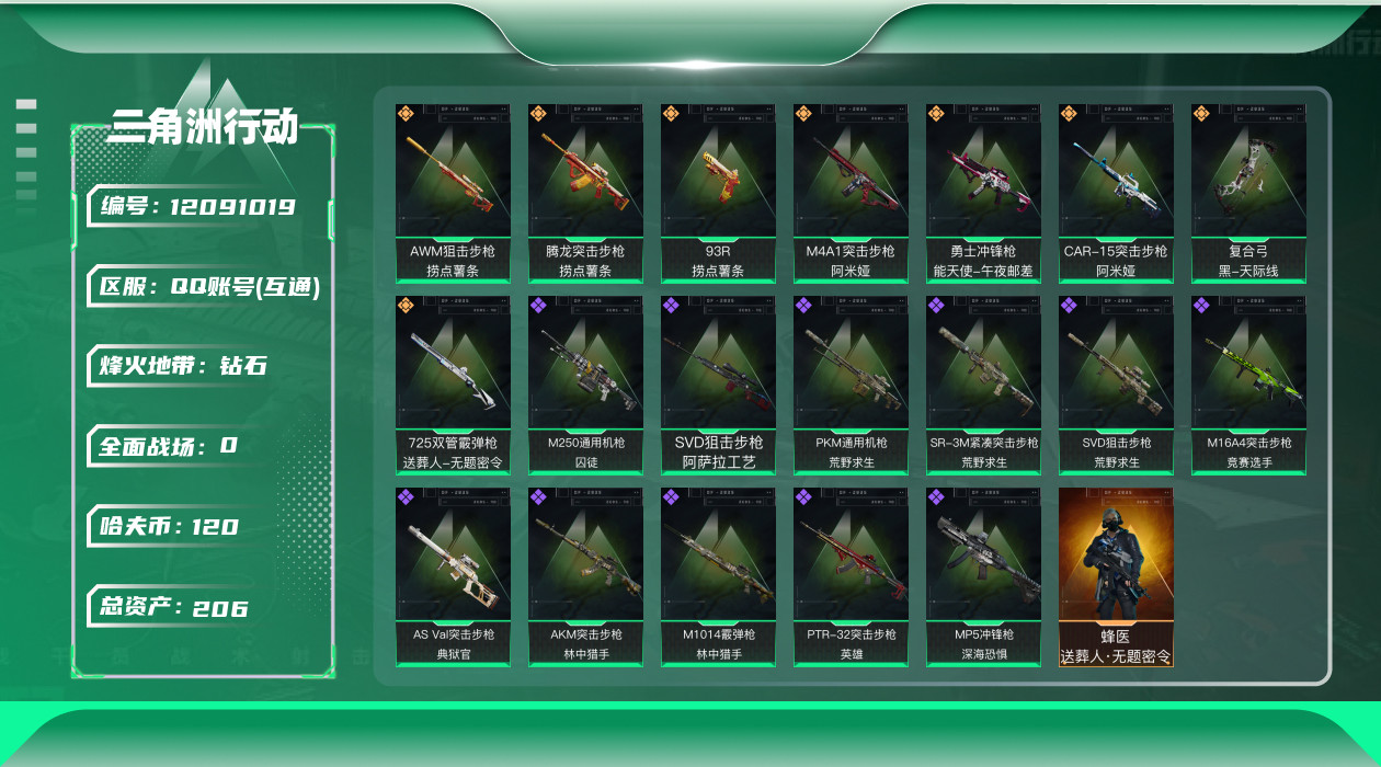 [12091019]总资产:206.9M 1干员外观 8传说枪械 哈夫币:120K 高级安全箱(2×3)9.15号到期 可二次 可修改实名 烽火地带段位:钻石 全面战场段位:军士长 传说武器皮肤:93R-捞点薯条,AWM狙击步枪-捞点薯条,腾龙突击步枪-捞点薯条,CAR-15突击步枪-阿米娅,勇士冲锋枪-能天使-午夜邮差,复合弓-黑-天际线,M4A1突击步枪-阿米娅,725双管霰弹枪-送葬人-无题密令 史诗武器皮肤:M16A4突击步枪-竞赛选手,PKM通用机枪-荒野求生,MP5冲锋枪-深海恐惧,AKM突击步枪-林中猎手,SR-3M紧凑突击步枪-荒野求生,M1014霰弹枪-林中猎手,PTR-32突击步枪-英雄,SVD狙击步枪-荒野求生,AS Val突击步枪-典狱官,M250通用机枪-囚徒,SVD狙击步枪-阿萨拉工艺 干员外观:蜂医-送葬人·无题密令(S5)