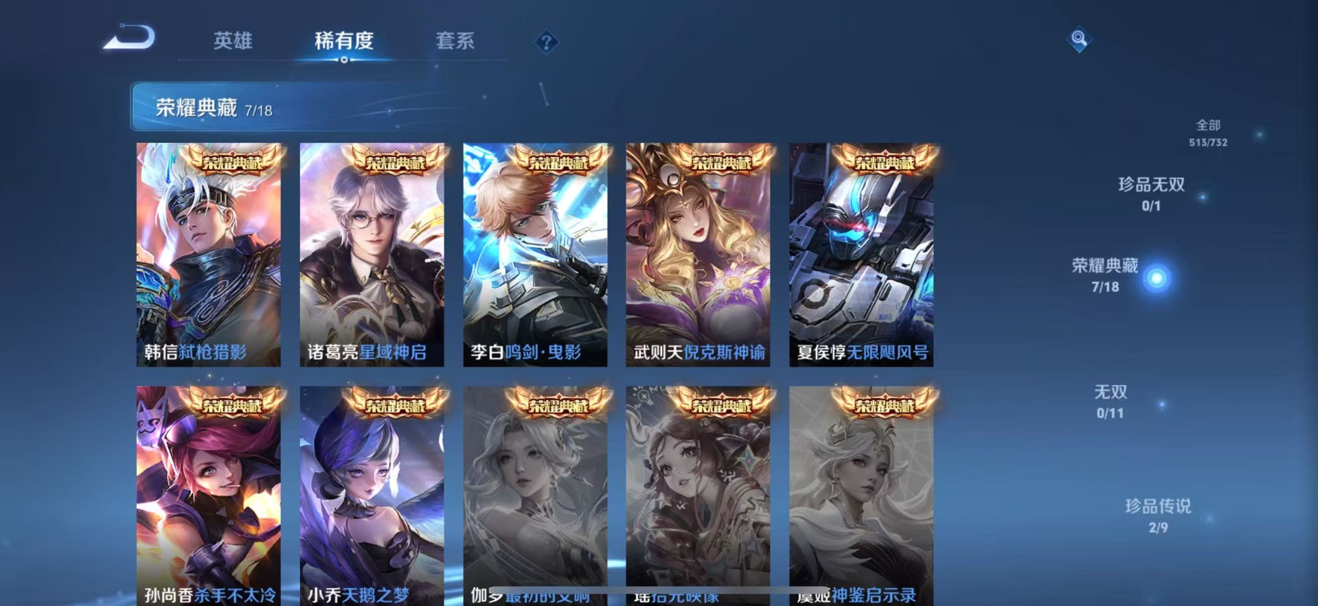 - PX_2095958-贵族等级: V8 英雄数: 124 皮肤数: 285 荣耀水晶: 天鹅之梦 星传说: 金色仲夏夜 传说皮: 云霓雀翎,末日机甲-孙尚香,仲夏夜之梦,音你心动-小乔,音你心动-周瑜,乞巧织情,超时空战士-狄仁杰,花朝如约,挚爱之约,挚爱花嫁,音你闪耀,山海·琳琅生,炽翼辉光 限定皮: 遇见飞天,游园惊梦,梁祝,白鹤梁神女,辉光之辰,白晶晶,天狼溯光者,天狼运算者,热情桑巴,纯白