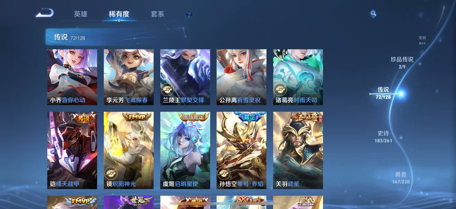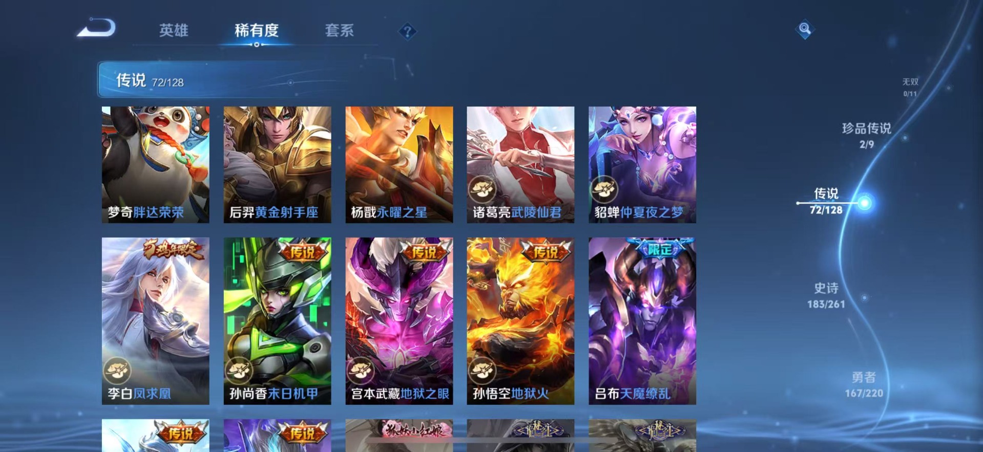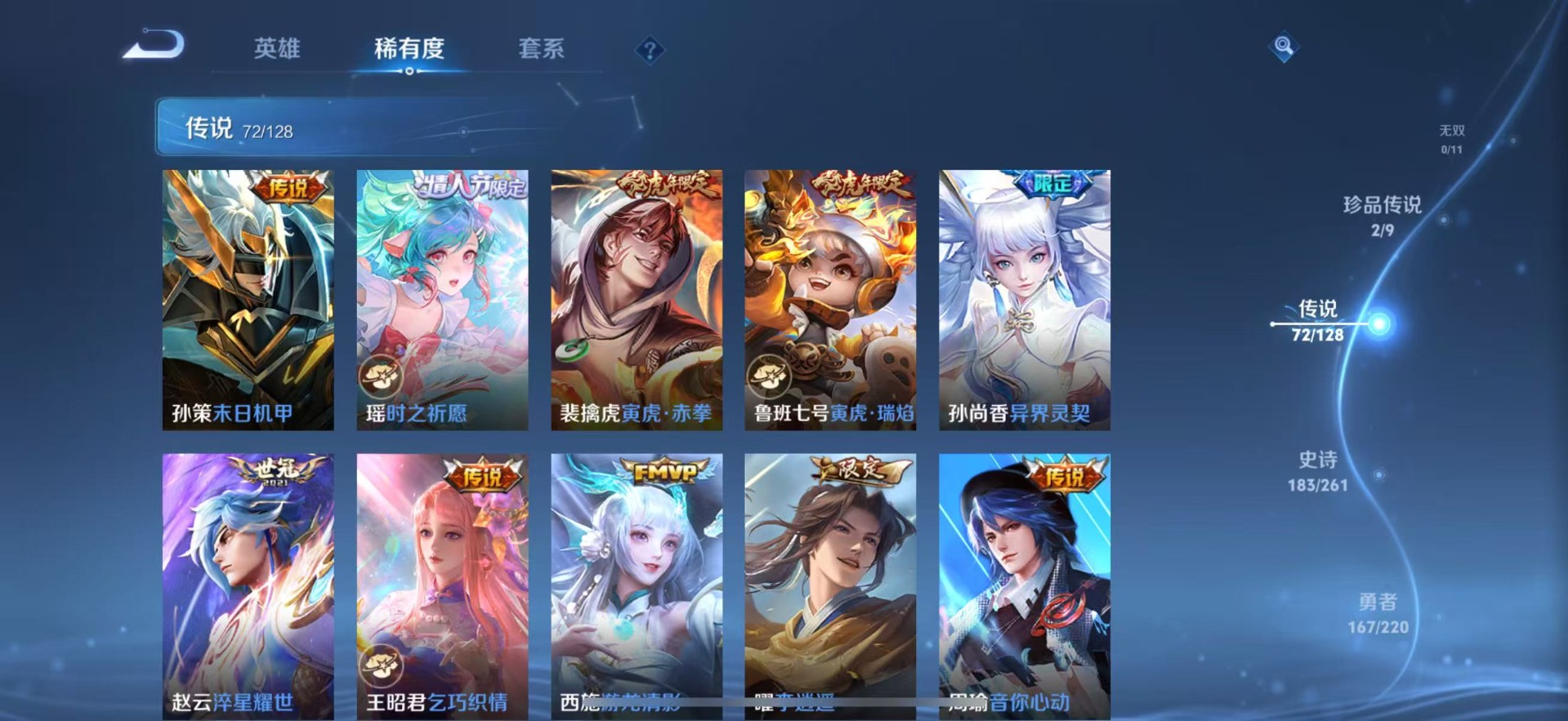 大乔白鹤梁神女,金蝉唐三藏,夏侯惇匿光决锋者,老夫子圣诞老人,哪吒逐梦之翼,甄姬幽恒,甄姬女儿国国王,甄姬至美·化雀舞,盾山梦圆繁星,铠青龙志,廉颇寅虎·御盾,曹操天狼征服者,伽罗太华,苏烈玄武志,赵云百木心枪,孙膑寅虎·展翼,干将莫邪冰霜恋舞曲,小乔纯白花嫁,孙尚香异界灵契,不知火舞绯月行,牛魔奔雷神使,项羽霸王别姬,鲁班七号寅虎·瑞焰,后羿无尽星芒,后羿如梦令,露娜启示之音,后羿辉光之辰,露娜一生所爱,庄周玄嵩,镜匿光追影者,庄周云端筑梦师,周瑜真爱至上,诸葛亮时雨天司,杨玉环寅虎·心曲,兰陵王默契交锋,公孙离祈雪灵祝,公孙离玉兔公主,公孙离蜜橘之夏,裴擒虎梅西,鲁班大师匿光启智者,裴擒虎李小龙,裴擒虎天狼狩猎者,裴擒虎寅虎·赤拳,东皇太一逐梦之光,上官婉儿梁祝,上官婉儿神器·万象笔,上官婉儿天狼绘梦者,李白诗剑行,花木兰默契交锋,花木兰瑞麟志,花木兰青春决赛季,安琪拉魔法小厨娘,马可波罗逐梦之星,马可波罗山海·玄木吟,马可波罗深海之息,西施至美·乘鲤谣,桑启鸣野蒿,猪八戒猪悟能,女娲补天,孙悟空孙行者,孙悟空大圣娶亲,芈月白晶晶,孙悟空至尊宝,孙悟空美猴王,百里玄策白虎志,马超神威,雅典娜神奇女侠,赵云引擎之心,云中君时之祈愿,妲己时之彼端,妲己时之奇旅,韩信傲雪梅枪,韩信飞衡,韩信逐梦之影,百里守约朱雀志,蔡文姬奇迹圣诞,瑶时之祈愿,瑶山海·碧波行,虞姬霸王别姬,娜可露露前尘镜,妲己热情桑巴,嫦娥如梦令,王昭君凤凰于飞,王昭君星穹之声,关羽武圣,关羽冰锋战神,橘右京枫霜尽