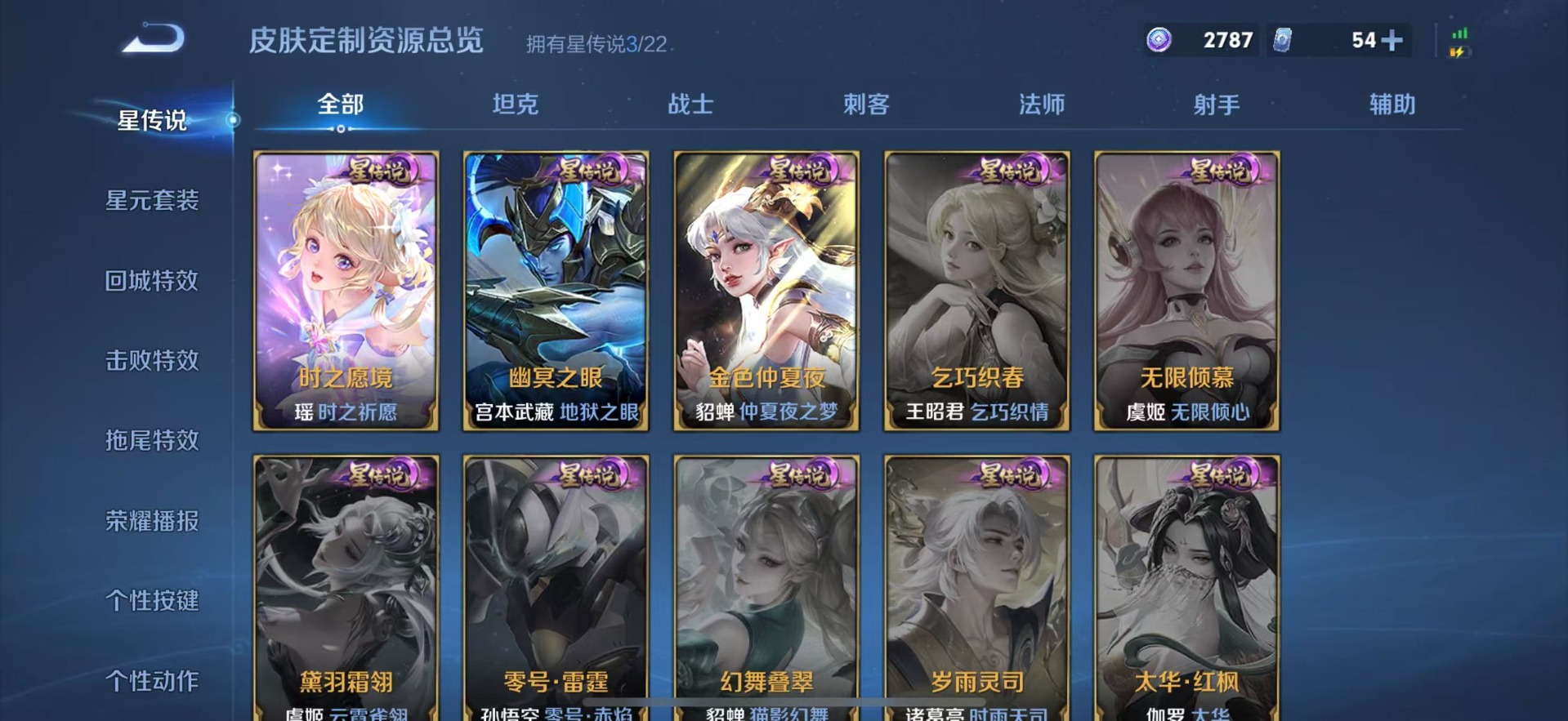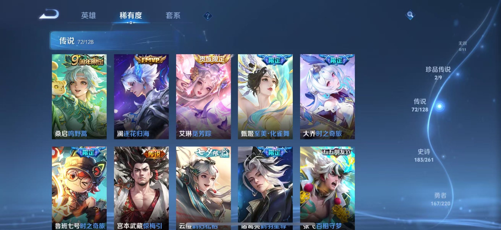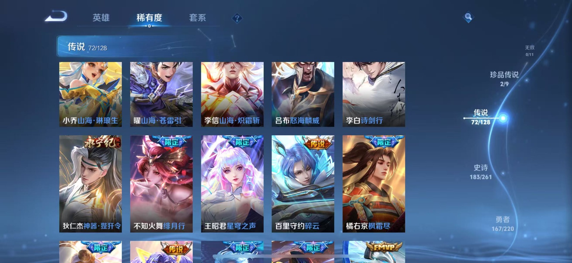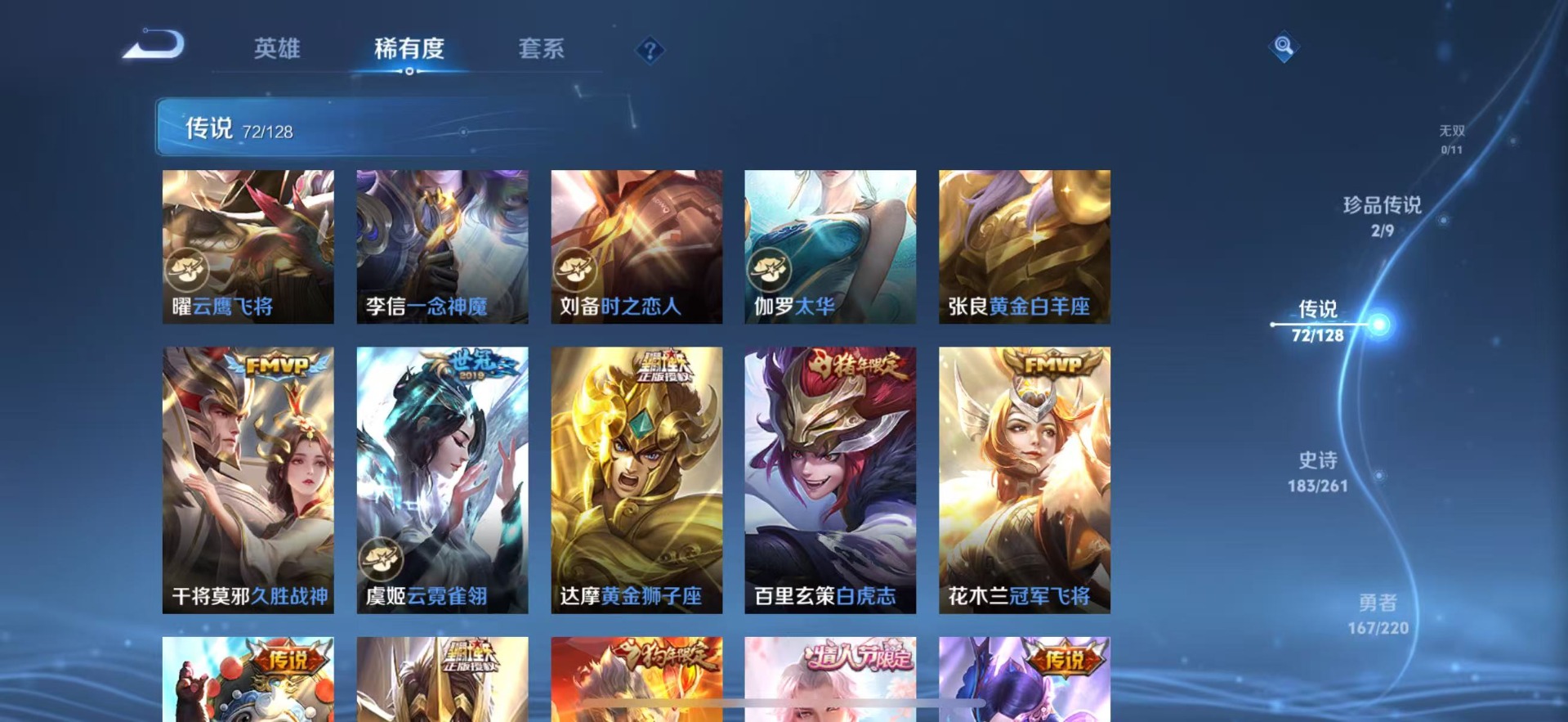 大乔白鹤梁神女,金蝉唐三藏,夏侯惇匿光决锋者,老夫子圣诞老人,哪吒逐梦之翼,甄姬幽恒,甄姬女儿国国王,甄姬至美·化雀舞,盾山梦圆繁星,铠青龙志,廉颇寅虎·御盾,曹操天狼征服者,伽罗太华,苏烈玄武志,赵云百木心枪,孙膑寅虎·展翼,干将莫邪冰霜恋舞曲,小乔纯白花嫁,孙尚香异界灵契,不知火舞绯月行,牛魔奔雷神使,项羽霸王别姬,鲁班七号寅虎·瑞焰,后羿无尽星芒,后羿如梦令,露娜启示之音,后羿辉光之辰,露娜一生所爱,庄周玄嵩,镜匿光追影者,庄周云端筑梦师,周瑜真爱至上,诸葛亮时雨天司,杨玉环寅虎·心曲,兰陵王默契交锋,公孙离祈雪灵祝,公孙离玉兔公主,公孙离蜜橘之夏,裴擒虎梅西,鲁班大师匿光启智者,裴擒虎李小龙,裴擒虎天狼狩猎者,裴擒虎寅虎·赤拳,东皇太一逐梦之光,上官婉儿梁祝,上官婉儿神器·万象笔,上官婉儿天狼绘梦者,李白诗剑行,花木兰默契交锋,花木兰瑞麟志,花木兰青春决赛季,安琪拉魔法小厨娘,马可波罗逐梦之星,马可波罗山海·玄木吟,马可波罗深海之息,西施至美·乘鲤谣,桑启鸣野蒿,猪八戒猪悟能,女娲补天,孙悟空孙行者,孙悟空大圣娶亲,芈月白晶晶,孙悟空至尊宝,孙悟空美猴王,百里玄策白虎志,马超神威,雅典娜神奇女侠,赵云引擎之心,云中君时之祈愿,妲己时之彼端,妲己时之奇旅,韩信傲雪梅枪,韩信飞衡,韩信逐梦之影,百里守约朱雀志,蔡文姬奇迹圣诞,瑶时之祈愿,瑶山海·碧波行,虞姬霸王别姬,娜可露露前尘镜,妲己热情桑巴,嫦娥如梦令,王昭君凤凰于飞,王昭君星穹之声,关羽武圣,关羽冰锋战神,橘右京枫霜尽