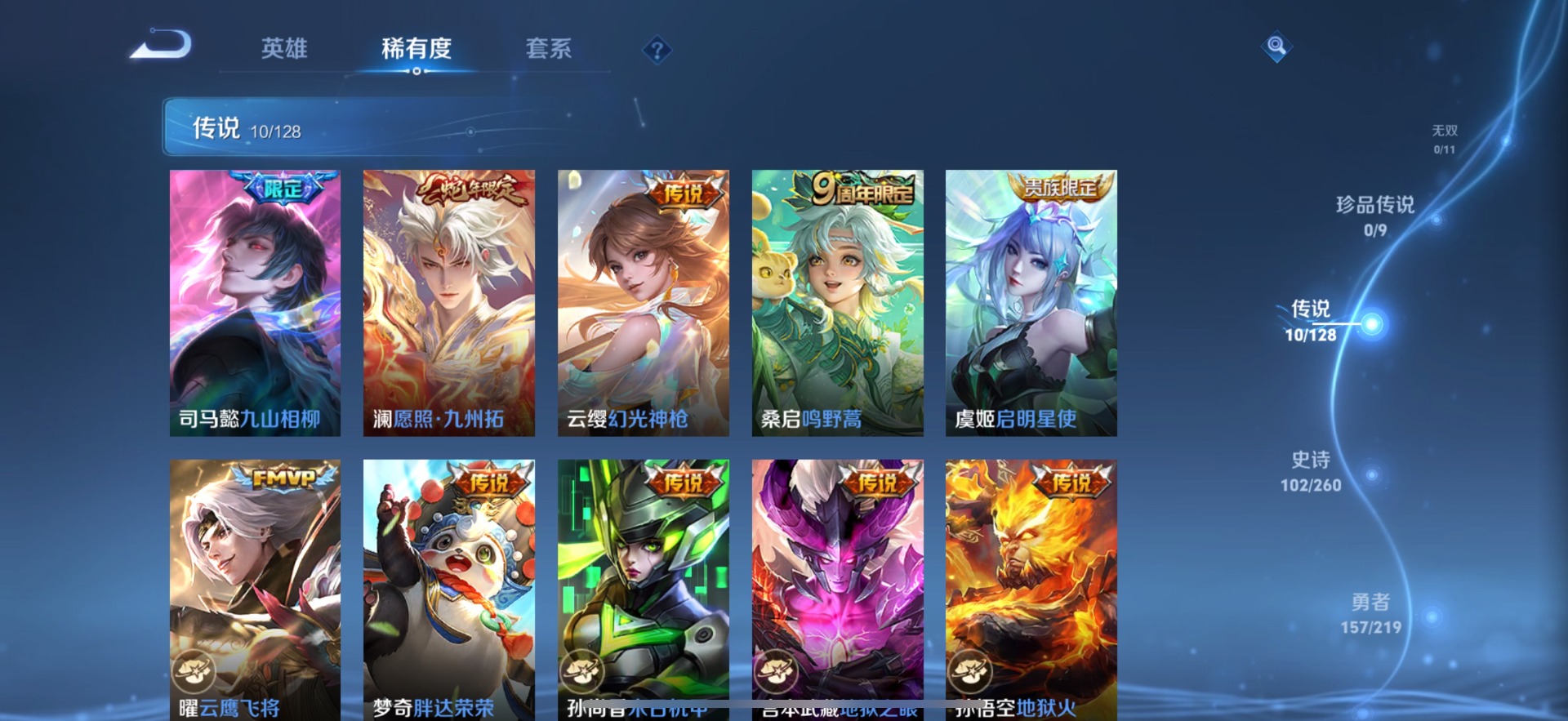 - [11864004]V7 7传说 124英雄 161皮肤 可修改实名 优质装备:末日机甲-孙尚香(绿蚂蚱),无双飞将,浮生妄,妄想实况 传说皮:云诺千山,祥瑞亨通 珍宝阁皮:妄想食味 限定皮:鸣野蒿,朱雀志(守约年限),蜜橘之夏 史诗皮:鸭鸭历险记-刘禅,飞车小橘子,狼魂孤将,绮世丹青,龙之律动,雪豹·霜爪,茶境仙,星界特工,永昼,末日机甲-莱西奥,蒙恬荣光圣徽,无限星赏官,末日机甲-吕布,乱世虎臣,摇滚巨星,水果甜心,星夜王子,暗隐猎兽者,幽灵船长,鬼剑武藏,缤纷独角兽,逐浪之夏,水晶猎龙者,原初追逐者,圣诞恋歌,鹰眼统帅,魅力维加斯,无心