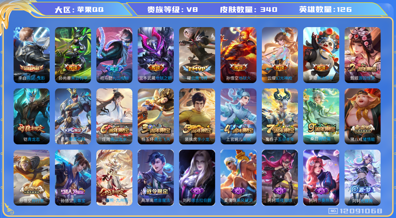[12091068]V8 1典藏 10传说 126英雄 340皮肤 典藏英雄武则天 可修改实名 优质装备:鸣剑·曳影,云鹰飞将(小将军),末日机甲-孙尚香(绿蚂蚱),地狱火,地狱之眼,胖达荣荣 传说皮:九山相柳,幻光神枪 珍宝阁皮:妄想食味,优雅恋人,蔷薇恋人 限定皮:愿照·九州拓(澜年限),逐霄战戟,鸣野蒿,至尊宝,遇见飞天,高山流水,五谷丰年,青龙志(铠年限),游园惊梦,梁祝,李小龙,孙行者,猪悟能 史诗皮:赞萌露比,器灵·浮梦炉,化蝶舞,星界战将,龙之律动,百相守梦-周瑜,幻珠鲛人,怒海争锋,破空之剑,战舞者,蒙犽顽岩魄,埋骨钱,百相守梦-百里守约,百相守梦-黄忠,紫霞仙子,电玩小子(小书包),白龙吟,黄金分割率,特工魅影,千年之狐,永昼,江河有灵,百解令(蒙犽),高渐离燃音魔法,蒙恬荣光圣徽,冰冠公主,偶像歌手,晚萤,电玩·爆裂旋风,暗夜猫娘,龙骑士(小龙虾),末日机甲-吕布,猫狗日记-孙策,乱世虎臣,节奏热浪,修罗,女仆咖啡,摇滚巨星,水果甜心,绅士熊喵,天才门将,星夜王子,心灵骇客,功夫厨神,德古拉伯爵,暗隐猎兽者,鬼剑武藏,乐园奇幻夜,舞动绿茵,地狱岩魂,纤云弄巧,繁星吟游(呼啦呼啦),拒霜思,缤纷独角兽,乘风破浪,逐浪之夏,水晶猎龙者,曙光守护者,金属风暴,原初追逐者,圣诞狂欢,圣诞恋歌,鹰眼统帅,王者之锤,暗夜贵公子,魅力维加斯,黎明之约,赏金猎手,无心,未来纪元-赵云