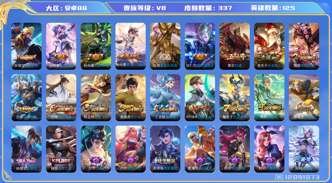 - [11528919]V10 5典藏 1珍品传说 35传说 126英雄 451皮肤 典藏英雄武则天 可修改实名 优质装备:天鹅之梦(小乔典藏),倪克斯神谕(宇宙婆娘),全息碎影(猴子典藏),银白咏叹调(倪克斯侍卫),弑枪猎影(韩信典藏),黄金狮子座,黄金射手座,冠军飞将,黄金白羊座,久胜战神,末日机甲-孙尚香(绿蚂蚱),地狱火,零号·赤焰,地狱之眼,音你心动-周瑜,时之恋人-刘备(电焊工),超时空战士-狄仁杰,山海·炽霜斩(李信年限),山海·琳琅生(小乔年限),山海·苍雷引(电光曜子),燃星之曲,艾琳觅芳踪,涂山容容 珍品传说:兔狲·蓬尾 传说皮:乘龙·淬吴钩(孙策年限),幻光神枪 珍宝阁皮:妄想食味,玩趣恶龙 限定皮:愿照·九州拓(澜年限),愿照·福禄聚(蔡文姬年限),愿照·岁时盈(虞姬年限),愿照·山河定(司空震年限),愿照·众生和(妲己年限),愿照·千秋盛(女娲年限),逐霄战戟,陌上桑,鸣野蒿,至尊宝,凤求凰(白切鸡),凤凰于飞,太华(伽罗年限),武陵仙君(小桃花),时之彼端,神威(电光马子),飞衡(韩信年限),玄嵩(庄周年限),山海·碧波行(瑶年限),无限倾心-项羽,影龙天霄,遇见飞天,无限倾心-虞姬,齐天大圣,五谷丰年,青龙志(铠年限),幽恒(沐浴露),游园惊梦,龙胆,逐梦之星,烈魂,岱宗(典韦年限),虎魄,天狼征服者,天狼绘梦者,李小龙,逐梦之影,朱雀志(守约年限),辉光之辰,大圣娶亲,引擎之心,天魔缭乱,青春决赛季,蜜橘之夏,山海·玄木吟(马可年限) 史诗皮:鸭鸭历险记-刘禅,器灵·浮梦炉,化蝶舞,灵蛊蚀心,星界战将,谪仙醉月,龙之律动,雪豹·霜爪,石田雨龙,百相守梦-周瑜,茶境仙,幻珠鲛人,怒海争锋,撼地雄心,破空之剑,蒙犽顽岩魄,埋骨钱,芈月浮光幕影,琥珀纪元伽罗,蔬乡物语(鲁班七号),百相守梦-百里守约,百相守梦-黄忠,织梦人,紫霞仙子,苍穹之光,电玩小子(小书包),白龙吟,黄金分割率,特工魅影,千年之狐,江河有灵,雪夜绮愿(周瑜),魅语,百解令(蒙犽),高渐离燃音魔法,蒙恬荣光圣徽,无限星赏官,冰冠公主,青蛇,偶像歌手,晚萤,暗夜猫娘,龙骑士(小龙虾),末日机甲-吕布,猫狗日记-孙策,猫狗日记-大乔,时之恋人-孙尚香,乱世虎臣,节奏热浪,修罗,女仆咖啡,摇滚巨星,水果甜心,绅士熊喵,天才门将,星夜王子,心灵骇客,功夫厨神,德古拉伯爵,暗隐猎兽者,幽灵船长,鬼剑武藏
