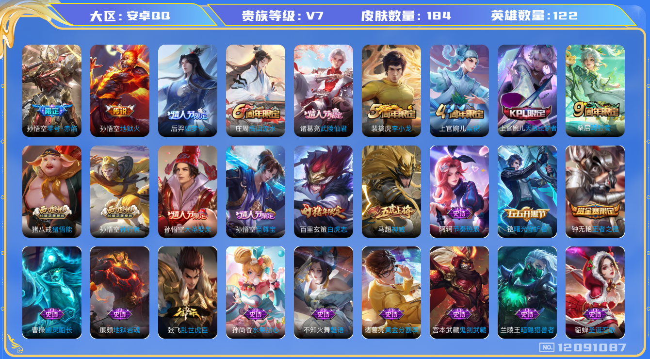 [12091087]V7 5传说 122英雄 184皮肤 可修改实名 优质装备:地狱火,零号·赤焰 珍宝阁皮:蔷薇恋人 限定皮:鸣野蒿,至尊宝,白虎志(电光耗子),武陵仙君(小桃花),神威(电光马子),高山流水,梁祝,天狼绘梦者,李小龙,如梦令-后羿,孙行者,猪悟能,大圣娶亲 史诗皮:黄金分割率,特工魅影,魅语,龙骑士(小龙虾),乱世虎臣,节奏热浪,修罗,水果甜心,星夜王子,暗隐猎兽者,幽灵船长,鬼剑武藏,地狱岩魂,纤云弄巧,繁星吟游(呼啦呼啦),拒霜思,逐浪之夏,水晶猎龙者,曙光守护者,金属风暴,原初追逐者,圣诞恋歌,鹰眼统帅,王者之锤,魅力维加斯,黎明之约,未来纪元-赵云