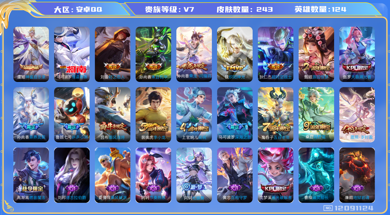 [12091124]V7 1典藏 1珍品传说 9传说 124英雄 243皮肤 可修改实名 优质装备:神鉴启示录,怪盗基德,炽阳神光,末日机甲-孙尚香(绿蚂蚱),时之恋人-刘备(电焊工),超时空战士-狄仁杰,涂山容容 传说皮:乘龙·问璇玑(孙尚香年限) 珍宝阁皮:万物之道,女武神,玩趣恶龙 限定皮:愿照·岁时盈(虞姬年限),鸣野蒿,异界灵契(白毛香),五谷丰年,游园惊梦,梁祝,御风骁将(吕布年限),天狼溯光者,李小龙,乒乒小将,深海之息(深海大菠萝) 史诗皮:化蝶舞,星界战将,龙之律动,石田雨龙,茶境仙,破空之剑,蒙犽顽岩魄,百相守梦-黄忠,黄金分割率,特工魅影,千年之狐,永昼,江河有灵,匿光侦查者,魅语,百解令(蒙犽),高渐离燃音魔法,蒙恬荣光圣徽,无限星赏官,匿光破解者,冰冠公主,偶像歌手,晚萤,末日机甲-吕布,猫狗日记-孙策,节奏热浪,修罗,女仆咖啡,摇滚巨星,水果甜心,绅士熊喵,天才门将,星夜王子,心灵骇客,功夫厨神,德古拉伯爵,暗隐猎兽者,幽灵船长,鬼剑武藏,地狱岩魂,纤云弄巧,缤纷独角兽,乘风破浪,逐浪之夏,水晶猎龙者,金属风暴,原初追逐者,圣诞狂欢,圣诞恋歌,鹰眼统帅,魅力维加斯,黎明之约,赏金猎手,奇遇舞章,无心,未来纪元-赵云