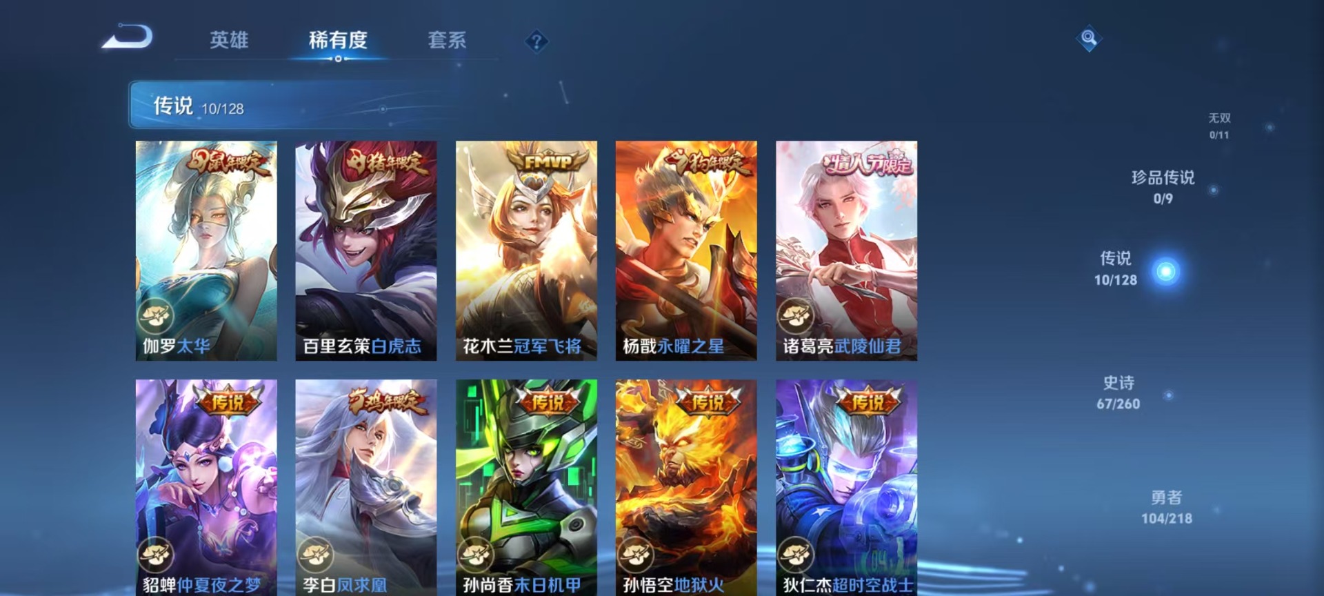 - PX_2080818-84 安卓QQ/最强王者/269皮肤/125英雄/3典藏/0珍品无双/0无双/1珍品传说/25传说/91史诗/9稀有英雄 【1 珍品传说】大耳狗之梦 瑶, 【3 典藏皮肤】鸣剑·曳影 李白,全息碎影 孙悟空,九霄神辉 花木兰, 【25 传说皮肤】胖达荣荣 梦奇,启明星使 虞姬,云霓雀翎 虞姬,时之祈愿 瑶,云鹰飞将 曜,补天 女娲,仲夏夜之梦 貂蝉,炽阳神光 镜,寅虎·瑞焰