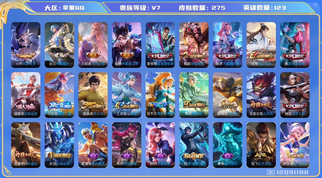 [12091188]V7 1典藏 6传说 123英雄 275皮肤 可修改实名 优质装备:天鹅之梦(小乔典藏),仲夏夜之梦(大飞蛾),乞巧织情,淬星耀世 珍宝阁皮:蔷薇恋人,玩趣恶龙 限定皮:鸣野蒿,白虎志(电光耗子),武陵仙君(小桃花),高山流水,匿光决锋者,冰锋战神,游园惊梦,梁祝,天狼溯光者,李小龙,逐梦之影,朱雀志(守约年限),孙行者,青春决赛季,蜜橘之夏,匿光追影者 史诗皮:星界战将,破空之剑,紫霞仙子,特工魅影,千年之狐,永昼,江河有灵,蒙恬荣光圣徽,冰冠公主,偶像歌手,电玩·爆裂旋风,暗夜猫娘,末日机甲-吕布,乱世虎臣,节奏热浪,摇滚巨星,水果甜心,天才门将,星夜王子,时之奇旅-安琪拉,功夫厨神,暗隐猎兽者,幽灵船长,鬼剑武藏,心灵战警,天秀·启明,纤云弄巧,拒霜思,乘风破浪,逐浪之夏,水晶猎龙者,曙光守护者,热力回旋,金属风暴,圣诞狂欢,鹰眼统帅,暗夜贵公子,魅力维加斯,黎明之约,无心,未来纪元-赵云,玫瑰异探