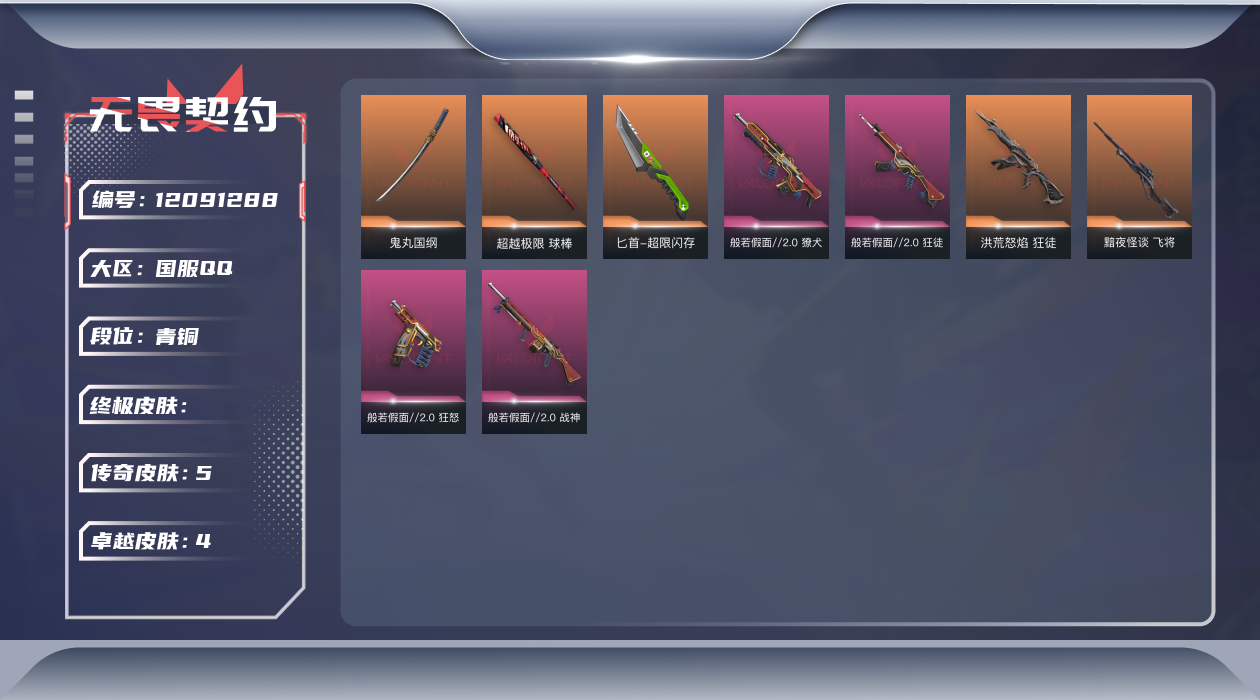 [12091288]5橙皮 4紫皮 21皮肤 27英雄 55卡面 420已用源晶 青铜 优质装备:狂徒-洪荒怒焰,球棒-超越极限,匕首-超限闪存,鬼丸国纲 套装:般若假面//2.0套装 佩枪皮肤:狂怒-般若假面//2.0 步枪皮肤:狂徒-般若假面//2.0,獠犬-般若假面//2.0 狙击枪皮肤:飞将-黯夜怪谈 机枪皮肤:战神-般若假面//2.0