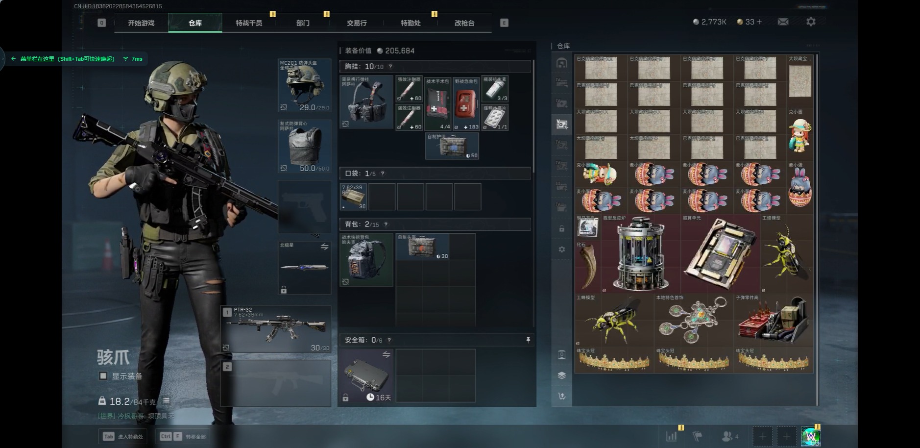 - [11601134]总资产:184.8 2干员外观 3传说枪械 顶级安全箱(3×3)9.15号到期 可二次 可修改实名 烽火地带段位:钻石 全面战场段位:无段位 哈夫币:35.206 传说武器皮肤:AK-12突击步枪-夜鹰,复合弓-黑-天际线,725双管霰弹枪-送葬人-无题密令 史诗武器皮肤:SR-25射手步枪-尖端治疗,PKM通用机枪-荒野求生,AS Val突击步枪-尖端治疗,M700狙击步枪-守夜人,SG552突击步枪-尖端治疗,Ash-12战斗步枪-守夜人,MP5冲锋枪-深海恐惧,SR-3M紧凑突击步枪-荒野求生,AKM突击步枪-林中猎手,M16A4突击步枪-竞赛选手,PKM通用机枪-守夜人,SVD狙击步枪-荒野求生,M1014霰弹枪-林中猎手,SV-98狙击步枪-林中猎手,PTR-32突击步枪-英雄,PSG-1射手步枪-无垢,AS Val突击步枪-典狱官,SV-98狙击步枪-囚徒,腾龙突击步枪-无垢,MP7冲锋枪-无垢,SVD狙击步枪-阿萨拉工艺 干员外观:无名-夜鹰,蜂医-送葬人·无题密令(S5)