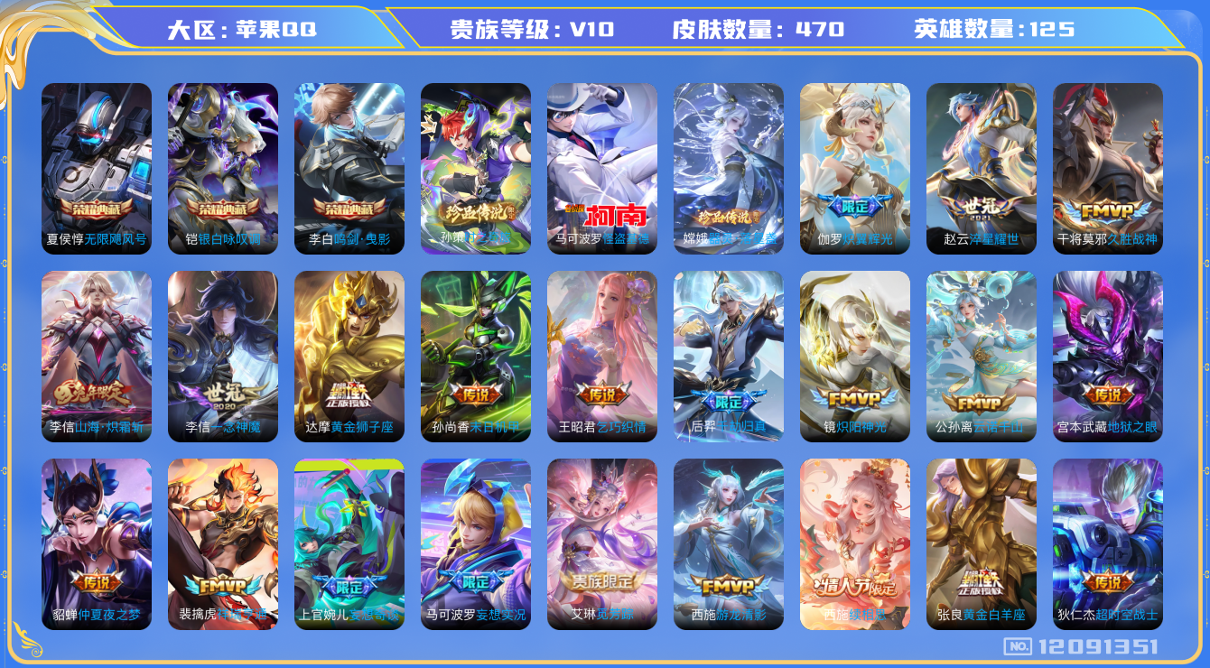 [12091351]V10 3典藏 3珍品传说 43传说 125英雄 470皮肤 可修改实名 优质装备:无限飓风号(高达),鸣剑·曳影,银白咏叹调(倪克斯侍卫),怪盗基德,器灵·落星盏,黄金狮子座,黄金白羊座,久胜战神,炽阳神光,一念神魔,末日机甲-孙尚香(绿蚂蚱),地狱火,仲夏夜之梦(大飞蛾),地狱之眼,李逍遥,乞巧织情,游龙清影(小青龙),淬星耀世,超时空战士-狄仁杰,无双飞将,山海·炽霜斩(李信年限),炽翼辉光(娃娃菜牛角包),妄想实况,妄想奇谈,澜逐花归海,艾琳觅芳踪,千劫归真,涂山容容 珍品传说:时之奇旅-孙策 传说皮:云诺千山,续相思,祥瑞亨通,幻光神枪 珍宝阁皮:胡桃夹子,女武神,玩趣恶龙 限定皮:愿照·九州拓(澜年限),愿照·福禄聚(蔡文姬年限),愿照·岁时盈(虞姬年限),愿照·山河定(司空震年限),愿照·众生和(妲己年限),愿照·千秋盛(女娲年限),逐霄战戟,陌上桑,鸣野蒿,至尊宝,白虎志(电光耗子),凤求凰(白切鸡),凤凰于飞,傲雪梅枪,绯月行,魔法小厨娘,白晶晶,时雨天司(水龙头),神威(电光马子),飞衡(韩信年限),高山流水,诗剑行,齐天大圣,冰锋战神,游园惊梦,梁祝,天狼狩猎者,逐梦之星,天狼征服者,祈雪灵祝(雪兔子),李小龙,逐梦之影,朱雀志(守约年限),永曜之星,辉光之辰,如梦令-后羿,霸王别姬-虞姬,默契交锋-兰陵王,默契交锋-花木兰,大圣娶亲,引擎之心,青春决赛季,神奇女侠,神器·万象笔,山海·玄木吟(马可年限),冰霜神祇 史诗皮:鸭鸭历险记-刘禅,器灵·浮梦炉,糖绘人间,狼魂孤将,绮世丹青,化蝶舞,灵蛊蚀心,星界战将,谪仙醉月,龙之律动,雪豹·霜爪,石田雨龙,百相守梦-周瑜,茶境仙,破空之剑,东方月初,蒙犽顽岩魄,埋骨钱,百相守梦-百里守约,星界特工,百相守梦-黄忠,织梦人,紫霞仙子,苍穹之光,电玩小子(小书包),黄金分割率,特工魅影,千年之狐,永昼,江河有灵,末日机甲-莱西奥,魅语,百解令(蒙犽),高渐离燃音魔法,蒙恬荣光圣徽,无限星赏官,冰冠公主,青蛇,偶像歌手,白蛇,晚萤,电玩·爆裂旋风,暗夜猫娘,龙骑士(小龙虾),末日机甲-吕布,猫狗日记-孙策,猫狗日记-大乔,乱世虎臣,节奏热浪,修罗,女仆咖啡,摇滚巨星,水果甜心,绅士熊喵,天才门将,星夜王子,心灵骇客,功夫厨神,德古拉伯爵,暗隐猎兽者,幽灵船长,鬼剑武藏,暗渊魔法,心灵战警,乐园奇幻夜,