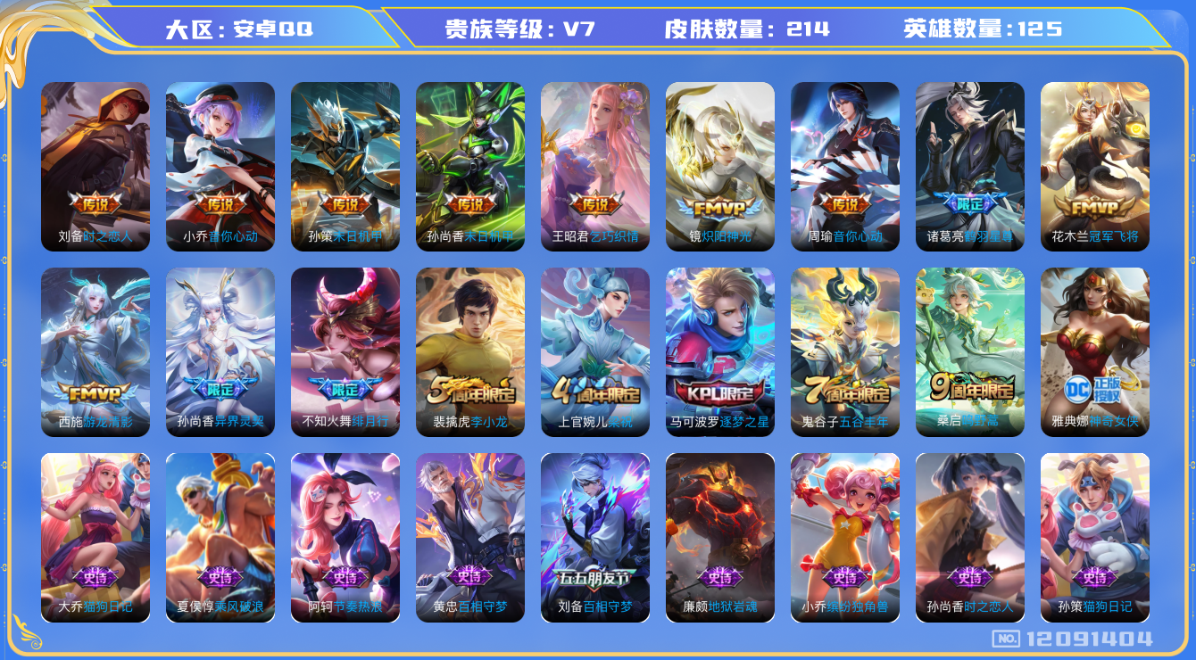 [12091404]V7 13传说 125英雄 214皮肤 可修改实名 优质装备:冠军飞将,炽阳神光,末日机甲-孙尚香(绿蚂蚱),音你心动-小乔,音你心动-周瑜,乞巧织情,时之恋人-刘备(电焊工),游龙清影(小青龙),末日机甲-孙策,鹤羽星尊 珍宝阁皮:蔷薇恋人 限定皮:鸣野蒿,异界灵契(白毛香),绯月行,五谷丰年,梁祝,逐梦之星,李小龙,神奇女侠 史诗皮:龙之律动,百相守梦-黄忠,电玩小子(小书包),特工魅影,江河有灵,魅语,百解令(蒙犽),冰冠公主,电玩·爆裂旋风,百相守梦(刘备),猫狗日记-孙策,猫狗日记-大乔,时之恋人-孙尚香,节奏热浪,女仆咖啡,水果甜心,绅士熊喵,星夜王子,心灵骇客,功夫厨神,暗隐猎兽者,鬼剑武藏,心灵战警,地狱岩魂,纤云弄巧,拒霜思,缤纷独角兽,乘风破浪,逐浪之夏,水晶猎龙者,金属风暴,圣诞恋歌,鹰眼统帅,暗夜贵公子,未来纪元-赵云