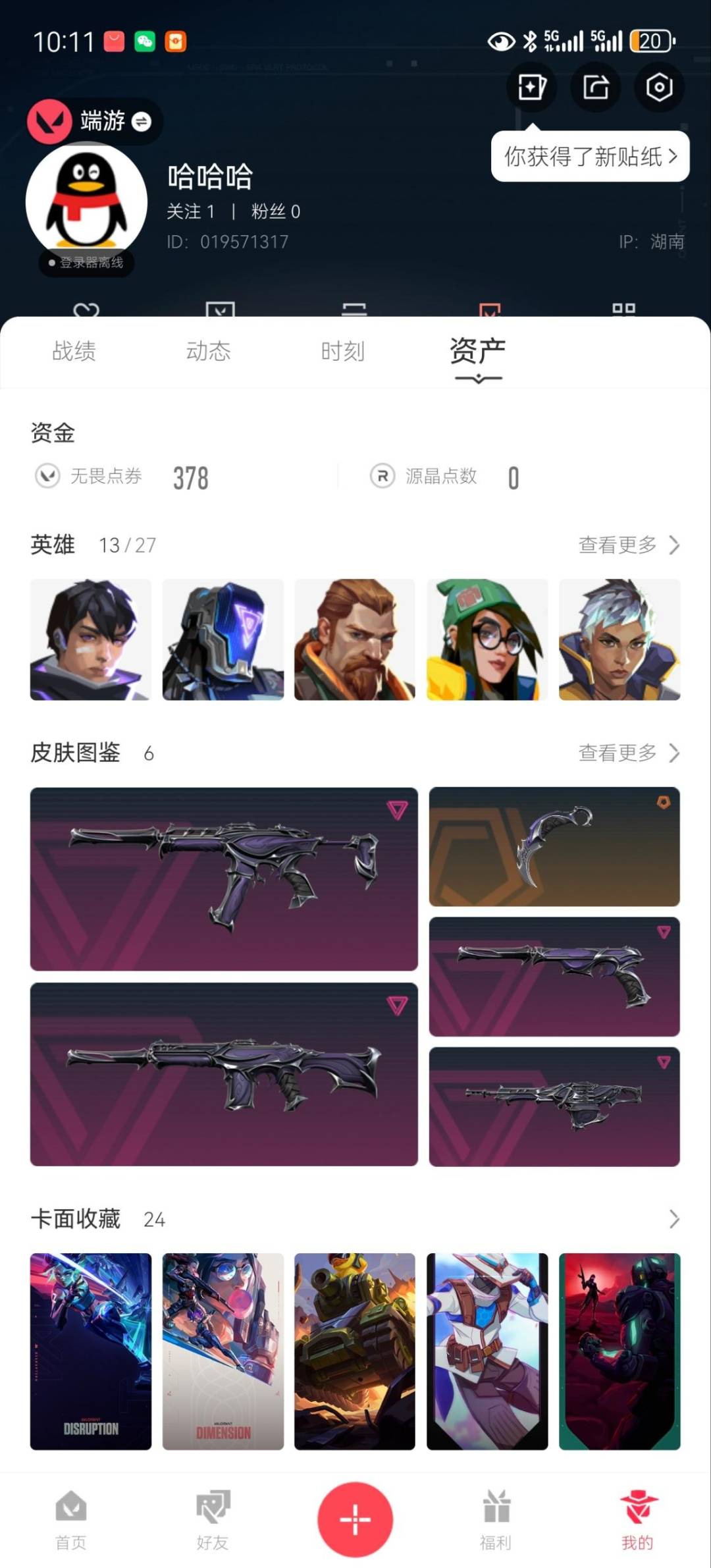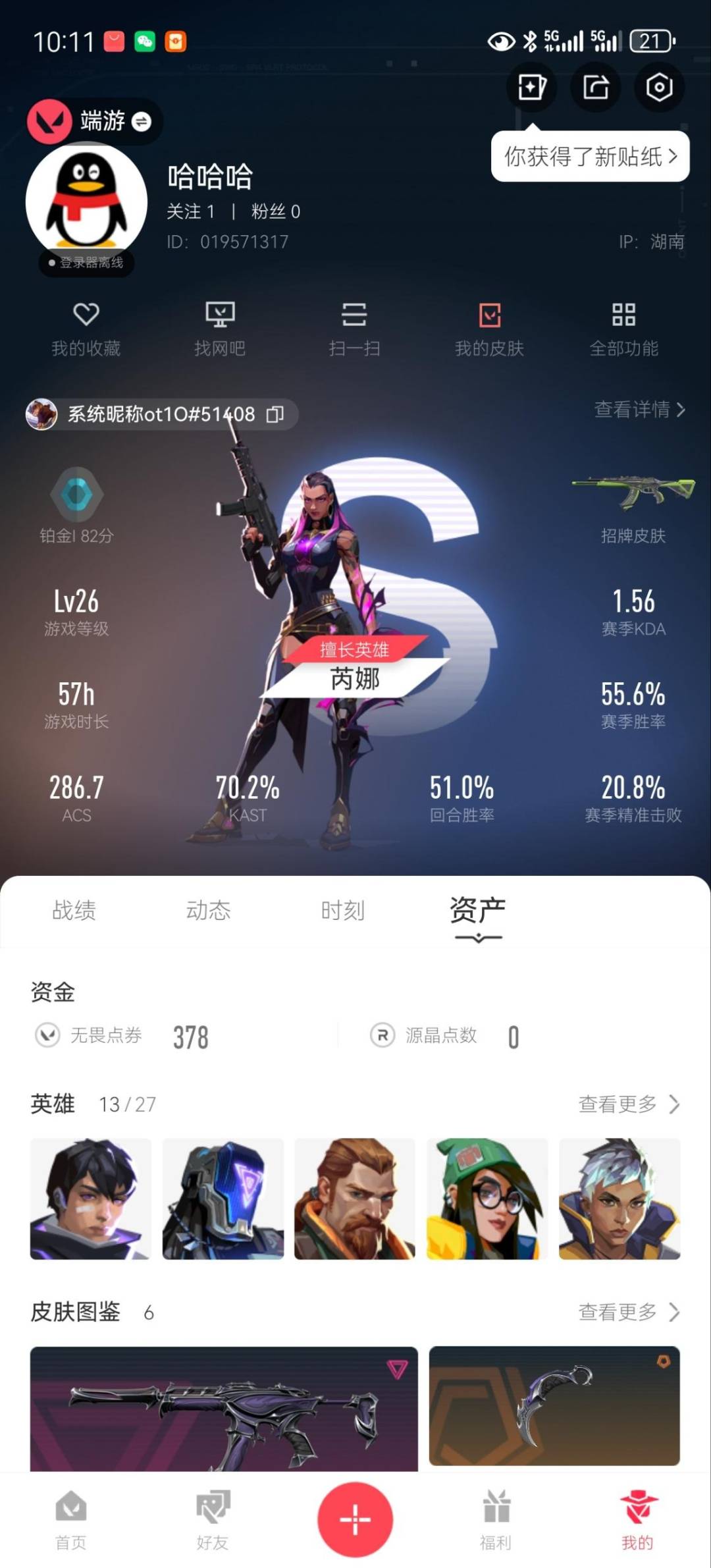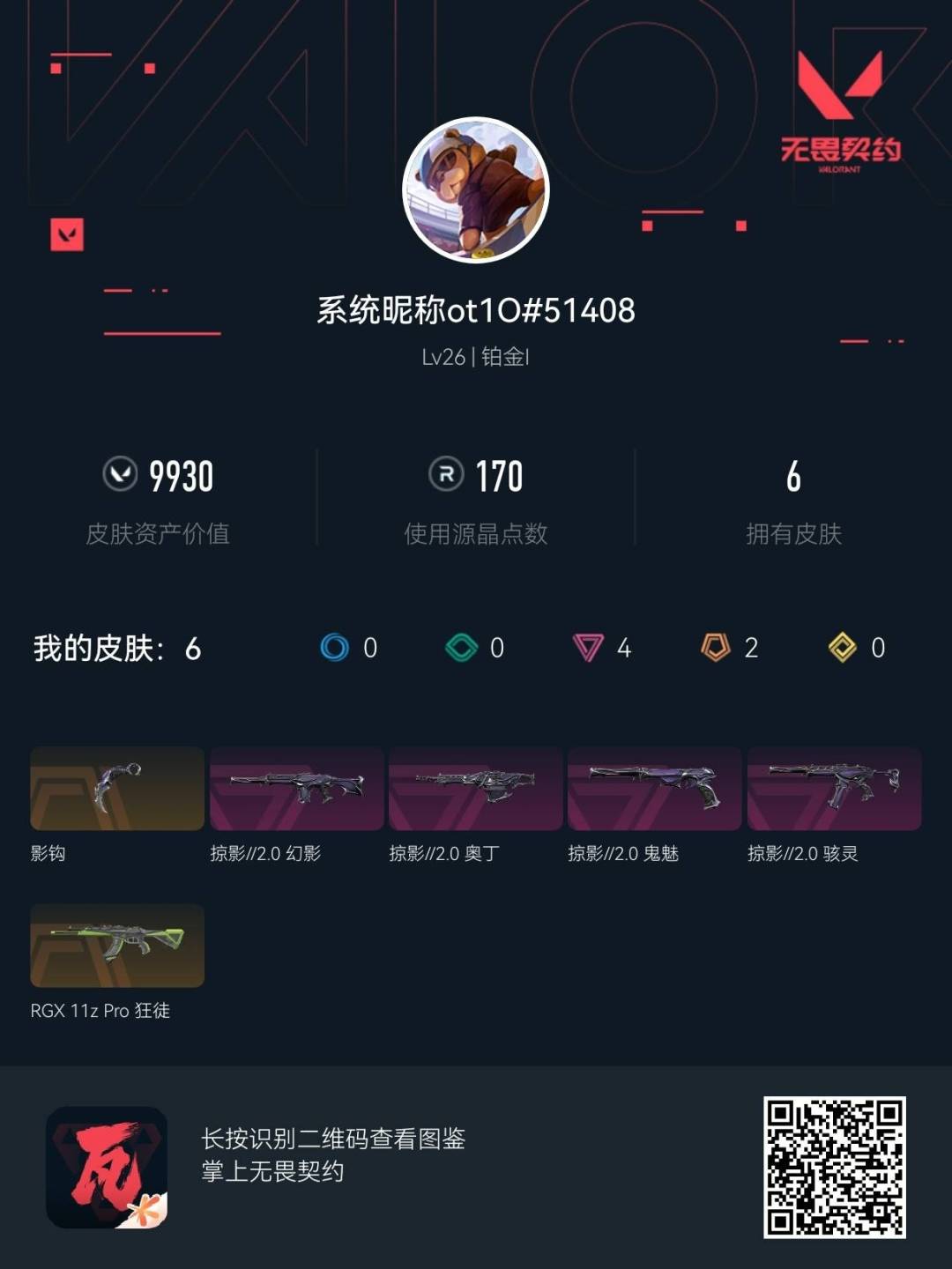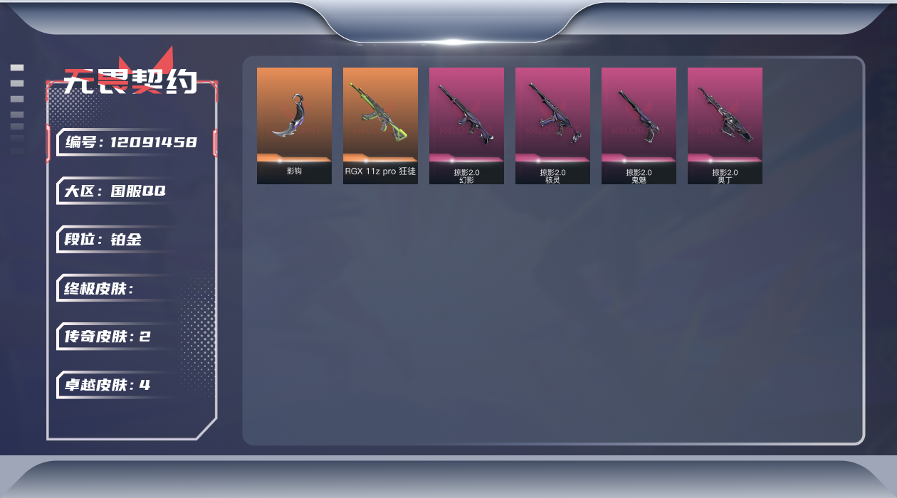 [12091458]2橙皮 4紫皮 6皮肤 13英雄 24卡面 170已用源晶 铂金 优质装备:影钩 套装:掠影2.0套装 佩枪皮肤:鬼魅-掠影2.0 冲锋枪皮肤:骇灵-掠影2.0 步枪皮肤:RGX 11z pro 狂徒,幻影-掠影2.0 机枪皮肤:奥丁-掠影2.0