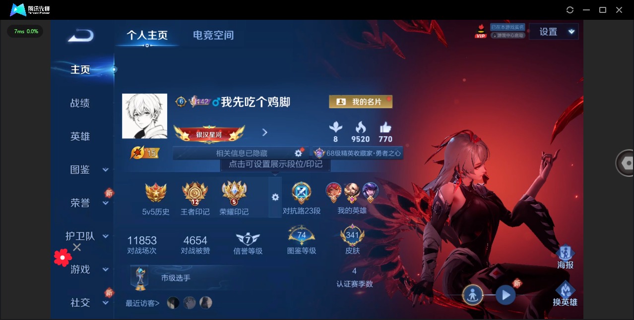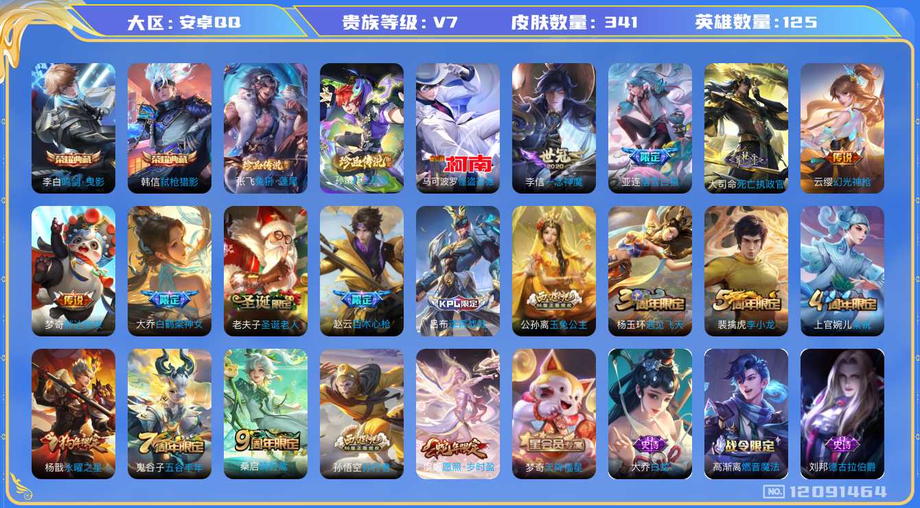 [12091464]V7 2典藏 3珍品传说 8传说 125英雄 341皮肤 可修改实名 优质装备:鸣剑·曳影,弑枪猎影(韩信典藏),怪盗基德,一念神魔,胖达荣荣,涂山容容 珍品传说:时之奇旅-孙策,兔狲·蓬尾 传说皮:落雪白狼,死亡执政官,幻光神枪 珍宝阁皮:妄想食味,蔷薇恋人 限定皮:愿照·岁时盈(虞姬年限),逐霄战戟,鸣野蒿,白鹤梁神女,遇见飞天,五谷丰年,梁祝,李小龙,永曜之星,圣诞老人,孙行者,百木心枪,玉兔公主,天降福星 史诗皮:鸭鸭历险记-刘禅,器灵·浮梦炉,化蝶舞,星界战将,谪仙醉月,龙之律动,雪豹·霜爪,石田雨龙,百相守梦-周瑜,茶境仙,破空之剑,战舞者,东方月初,蒙犽顽岩魄,琥珀纪元伽罗,蔬乡物语(鲁班七号),百相守梦-百里守约,百相守梦-黄忠,织梦人,紫霞仙子,特工魅影,江河有灵,雪夜绮愿(周瑜),魅语,百解令(蒙犽),高渐离燃音魔法,蒙恬荣光圣徽,偶像歌手,白蛇,电玩·爆裂旋风,末日机甲-吕布,猫狗日记-孙策,乱世虎臣,节奏热浪,女仆咖啡,摇滚巨星,水果甜心,天才门将,星夜王子,心灵骇客,功夫厨神,德古拉伯爵,暗隐猎兽者,幽灵船长,鬼剑武藏,心灵战警,乐园奇幻夜,舞动绿茵,地狱岩魂,纤云弄巧,拒霜思,缤纷独角兽,乘风破浪,逐浪之夏,水晶猎龙者,曙光守护者,金属风暴,原初追逐者,圣诞狂欢,圣诞恋歌,鹰眼统帅,王者之锤,魅力维加斯,未来纪元-赵云