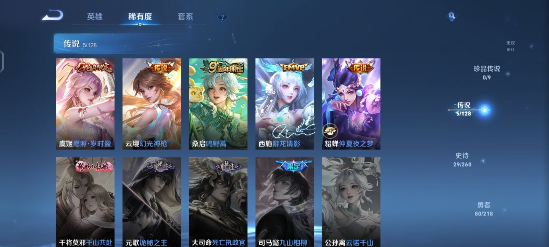 - [11604246]V7 4传说 110英雄 116皮肤 可修改实名 安全保护中 传说皮:地狱之眼,冠军飞将,超时空战士-狄仁杰 限定皮:凤求凰(白切鸡),遇见飞天,冰锋战神,游园惊梦,梁祝,逐梦之光,真爱至上 史诗皮:白龙吟,特工魅影,千年之狐,偶像歌手,乱世虎臣,天才门将,星夜王子,德古拉伯爵,暗隐猎兽者,乘风破浪,逐浪之夏,水晶猎龙者,原初追逐者,圣诞狂欢,圣诞恋歌,鹰眼统帅,魅力维加斯,未来纪元-赵云